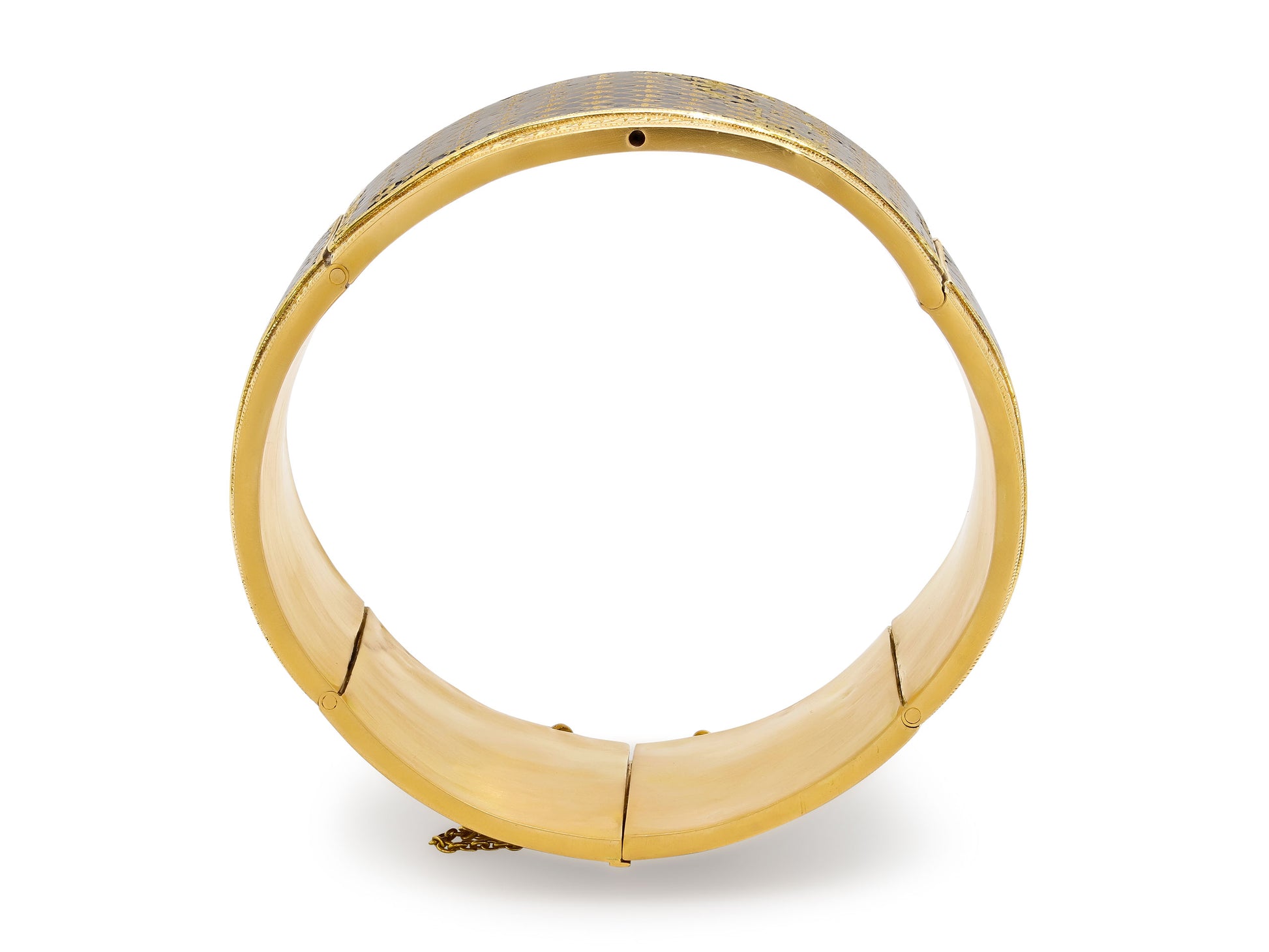 The wide paneled bangle set with black enamel in a criss-cross pattern to the geometrical etched boarders, in 18k yellow gold.