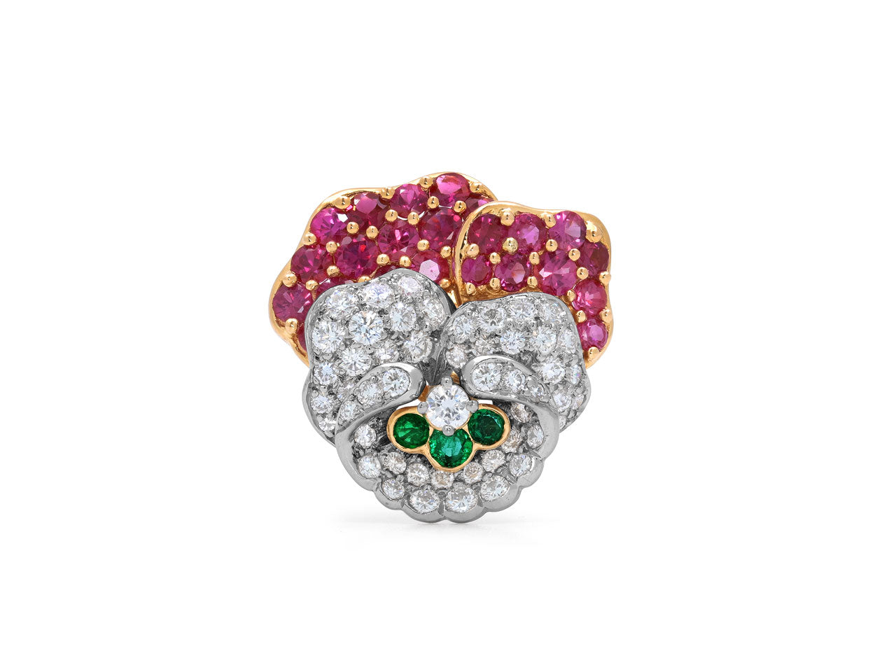 Designed as a pansy flower, the outer petals set with rubies in 18k yellow gold, and the inner petals set with diamonds in platinum, accented with three round emeralds. Signed Tiffany & Co. Includes manufacturer's box.