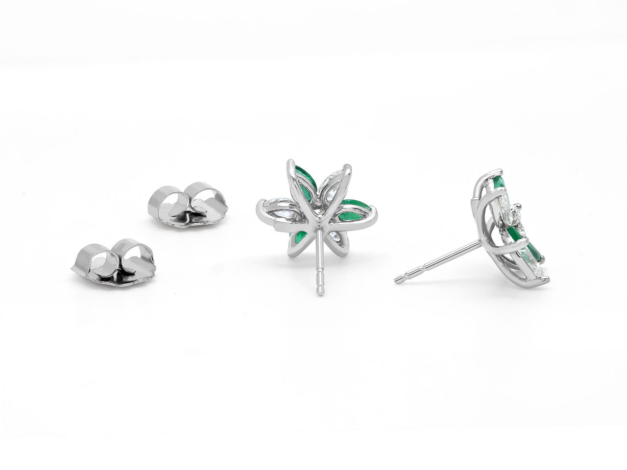 Each flower motif earring centering on a round brilliant diamond extending to six alternating pear shape diamonds and pear shape emeralds, in platinum with 18k white gold friction backs.