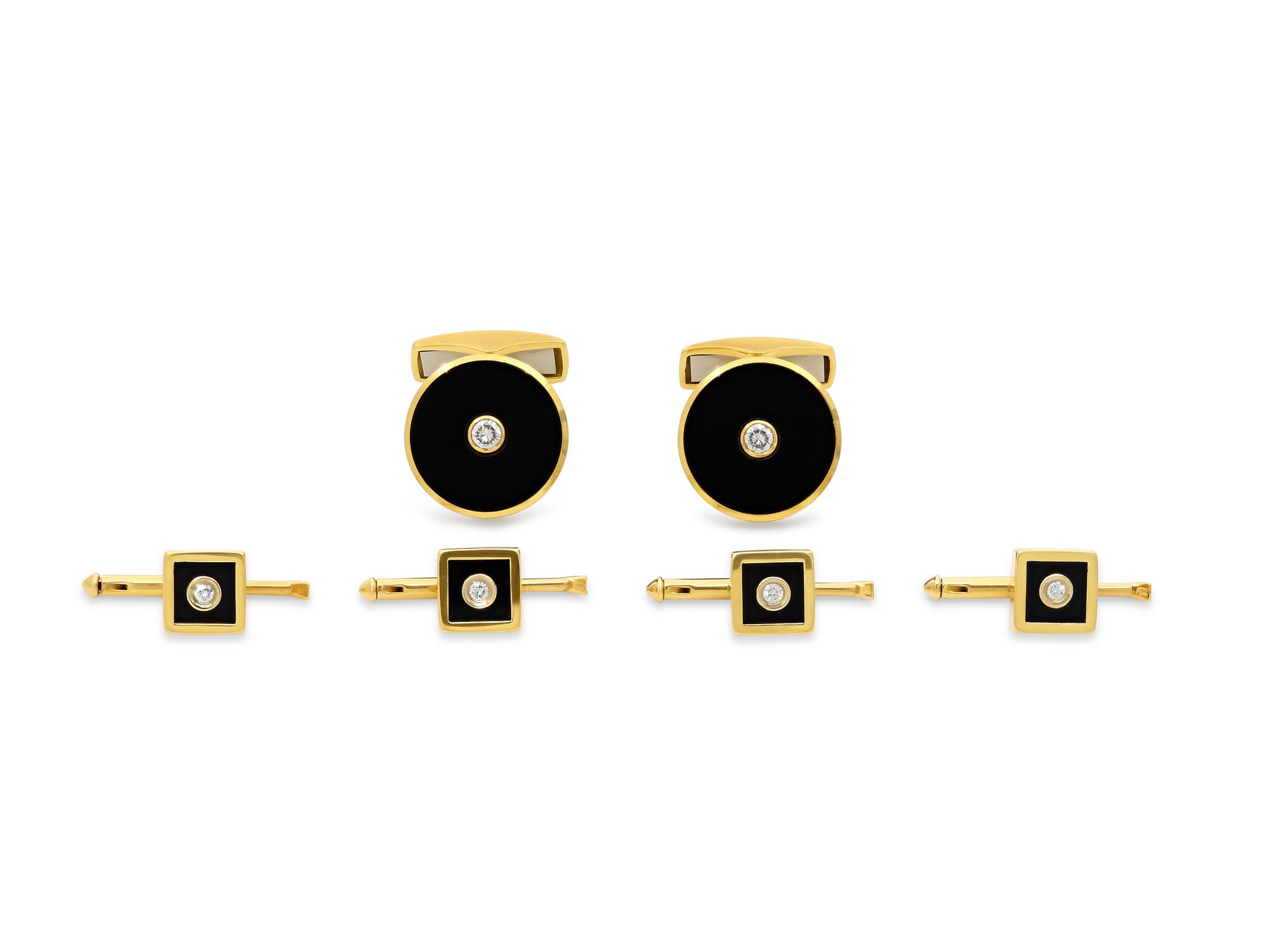 Each cufflink set with circular onyx disc and bezel-set diamond accent, to the 18k yellow gold bar terminal, together with four square shirt studs en suite. Signed W. Germany.