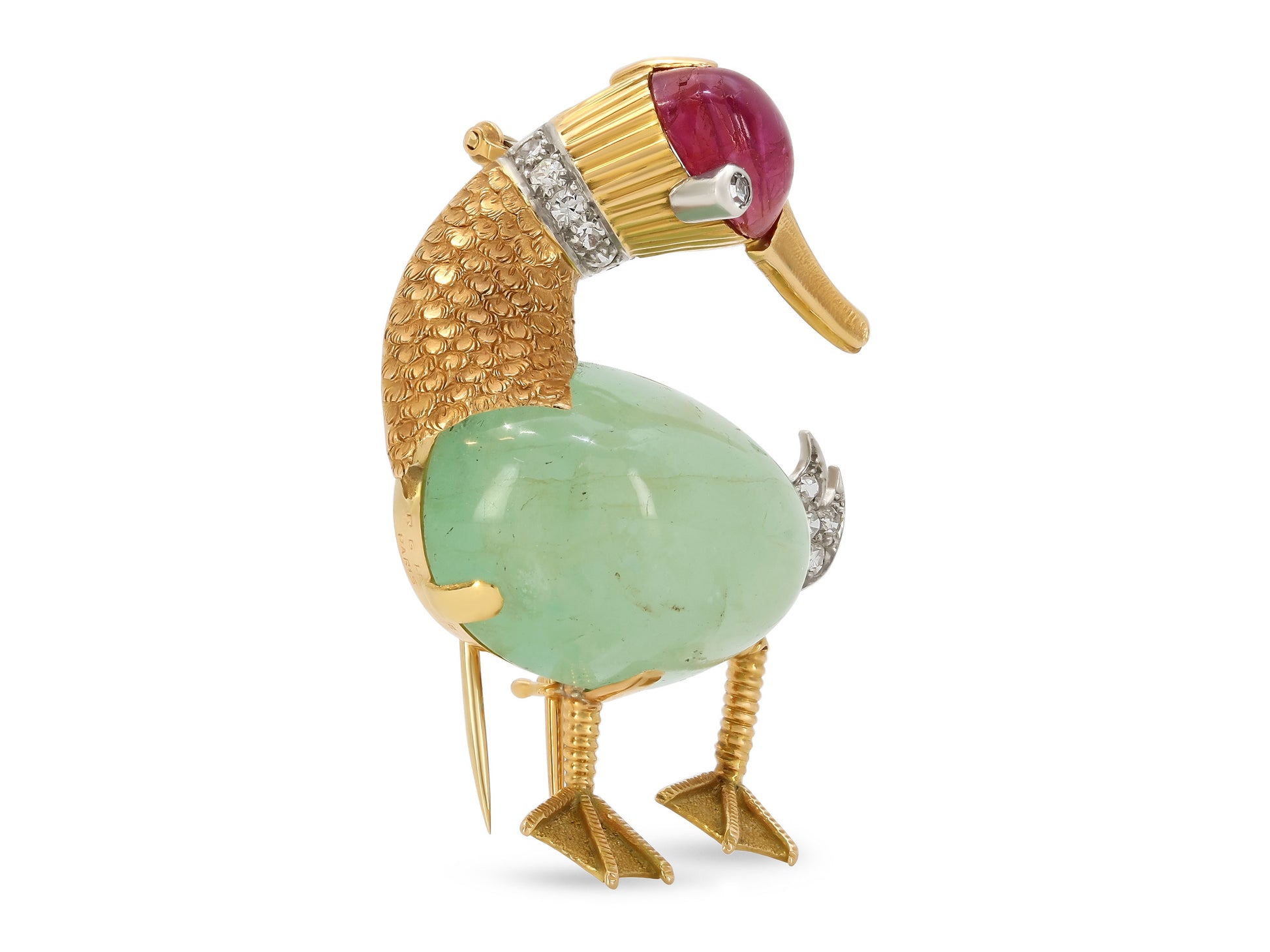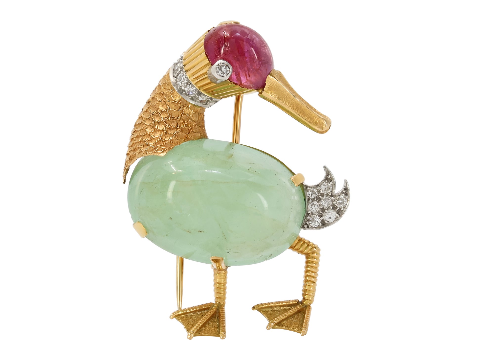 Depicting a duck with a cabochon emerald body, textured 18k yellow gold neck, feet and bill. With cabochon ruby head, diamond eyes and collar, the diamond tail in platinum. Signed RG Le Compte Paris, with French metalmarks.