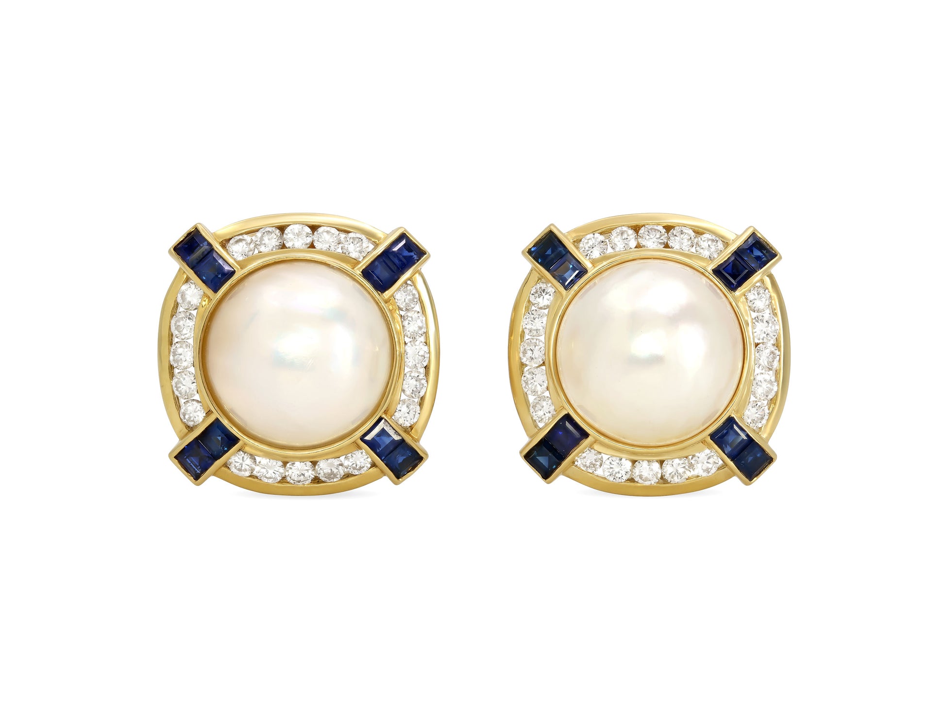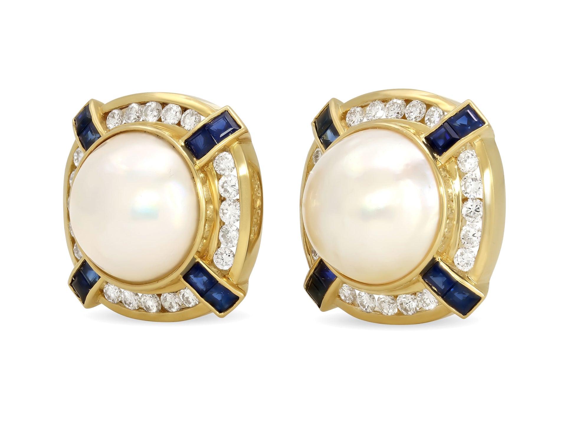 The bezel-set mabe pearls in a surround of channel-set diamonds, accented by four pairs of square step-cut sapphires. In 18k yellow gold, with posts and omega backs.
