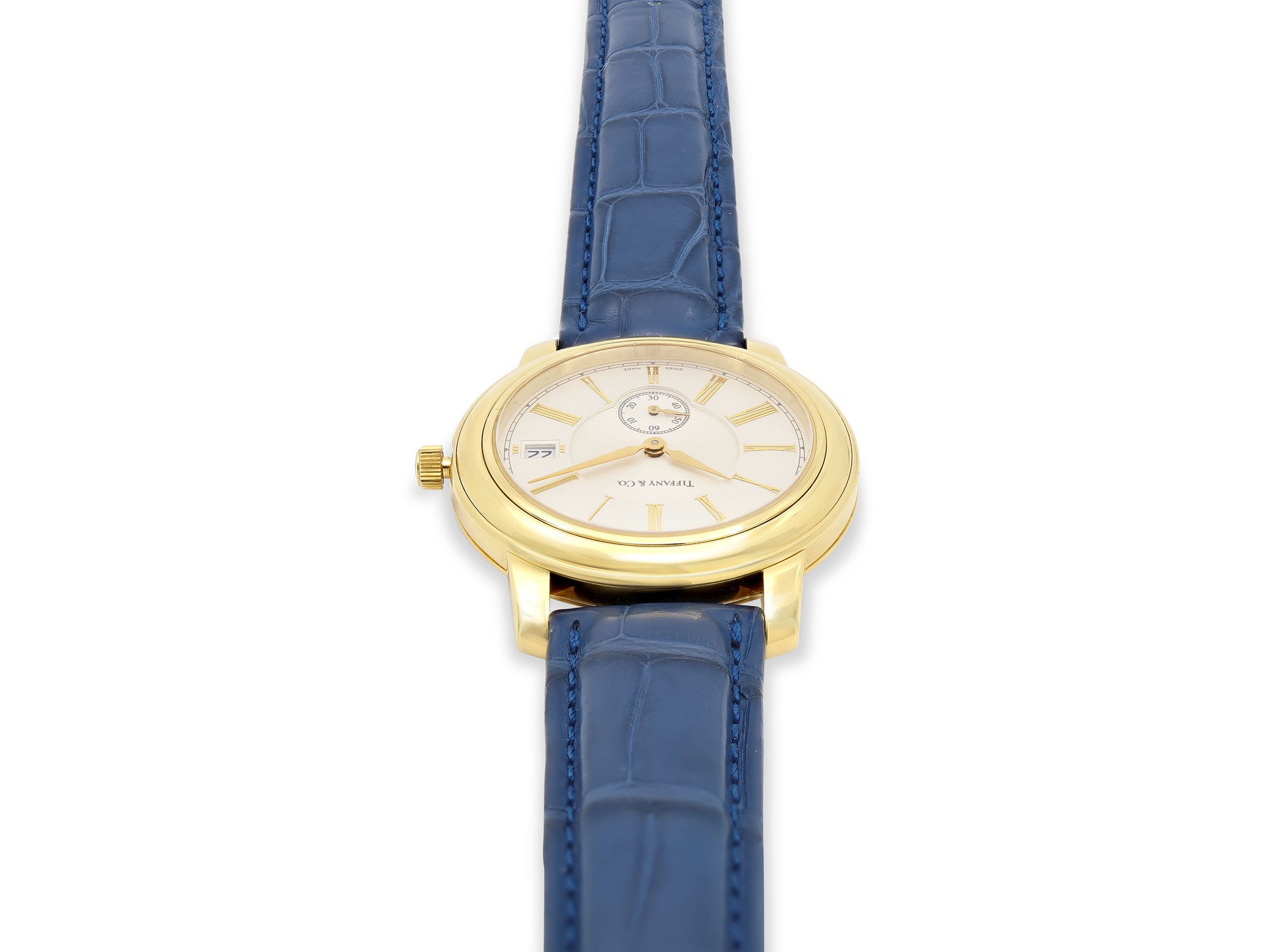 Circular ivory guilloché dial with gold hands and Roman numeral hour markers, date aperture, subsidiary dials for constant seconds, 18k yellow gold case, with blue alligator strap and 18k gold buckle. Dial, case, buckle, and strap signed Tiffany & Co.