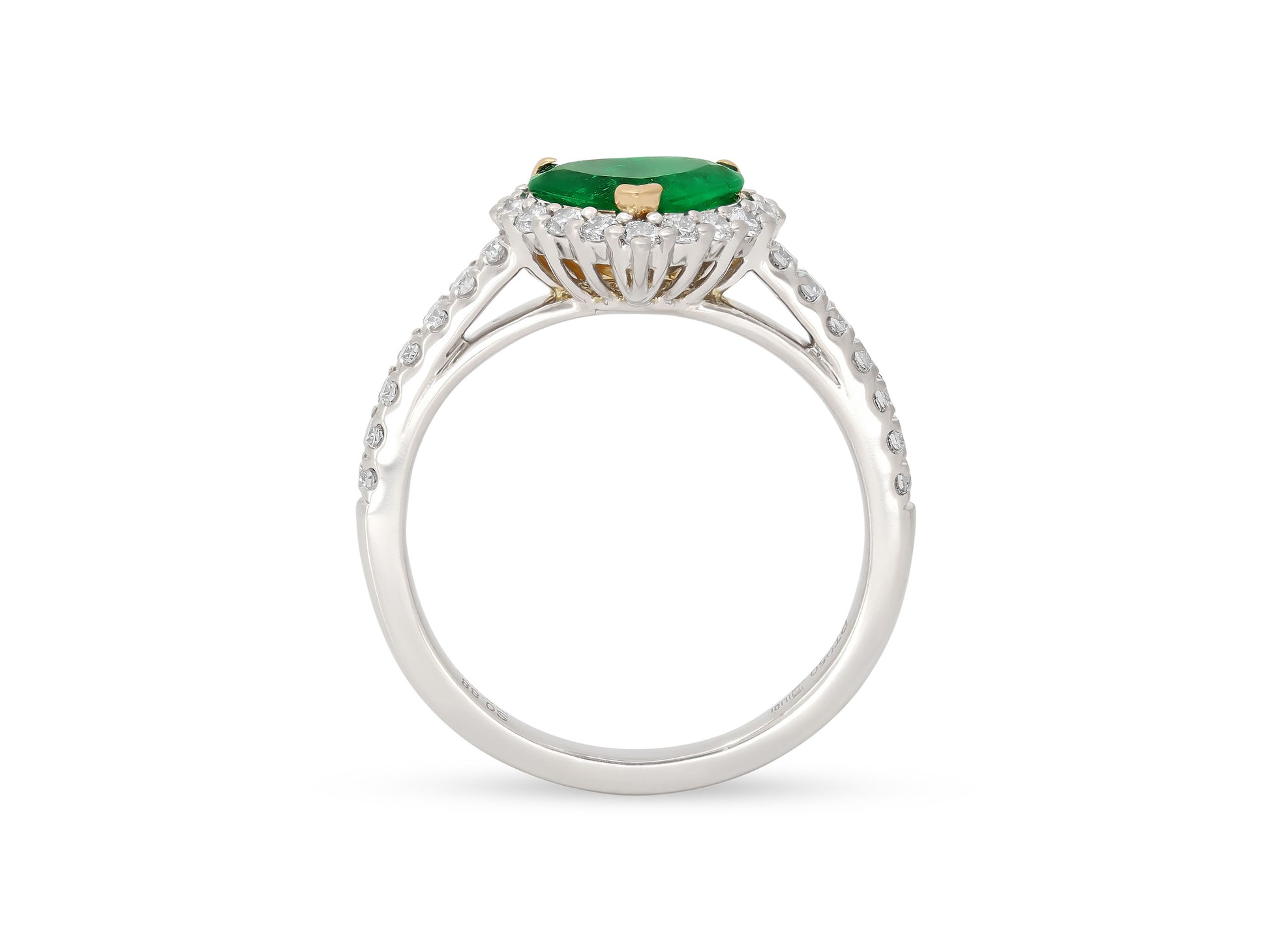 The heart shape emerald prong set in 18k yellow gold, within a diamond halo, to the diamond set shoulders in platinum. Signed Emilio.