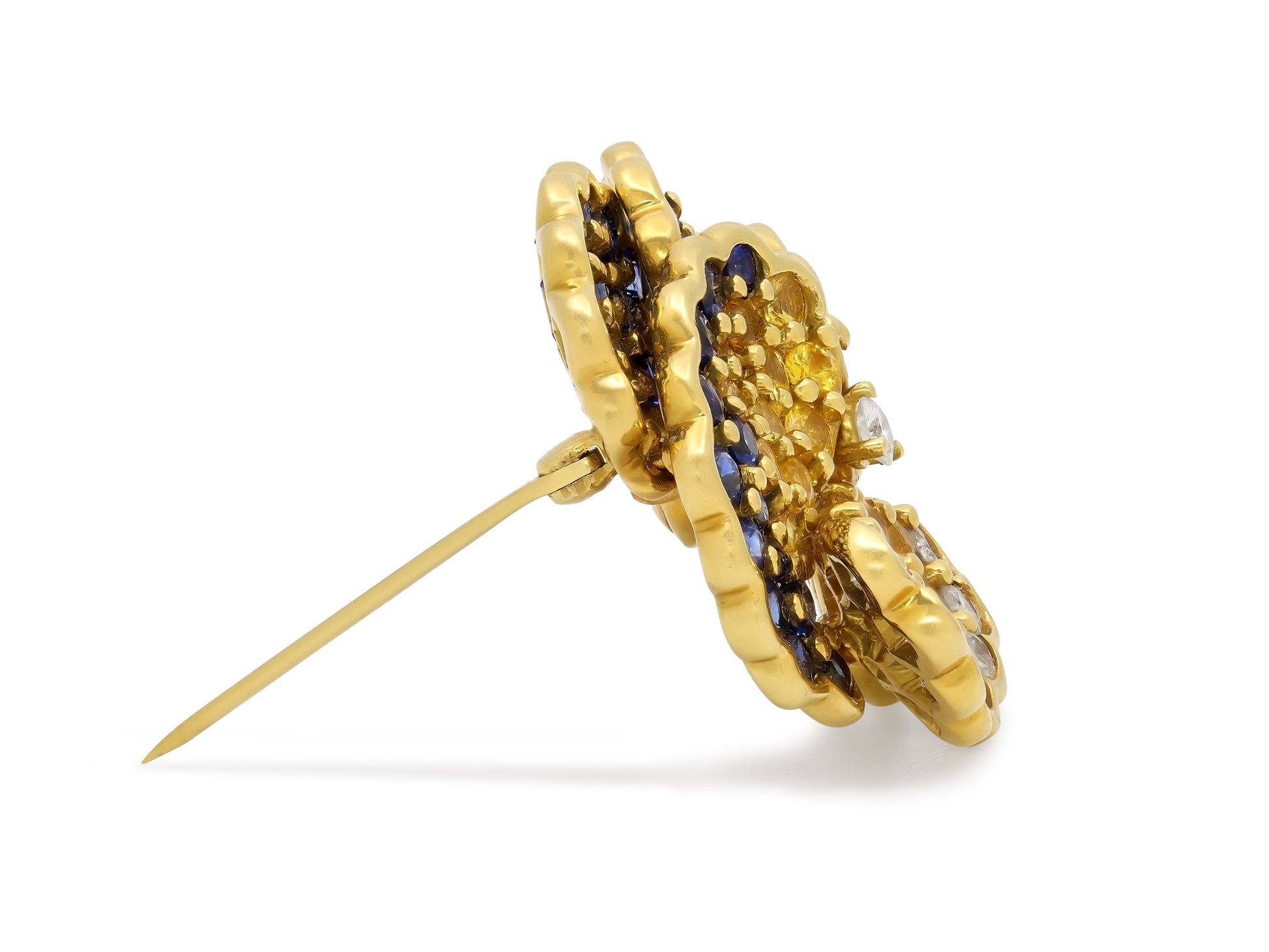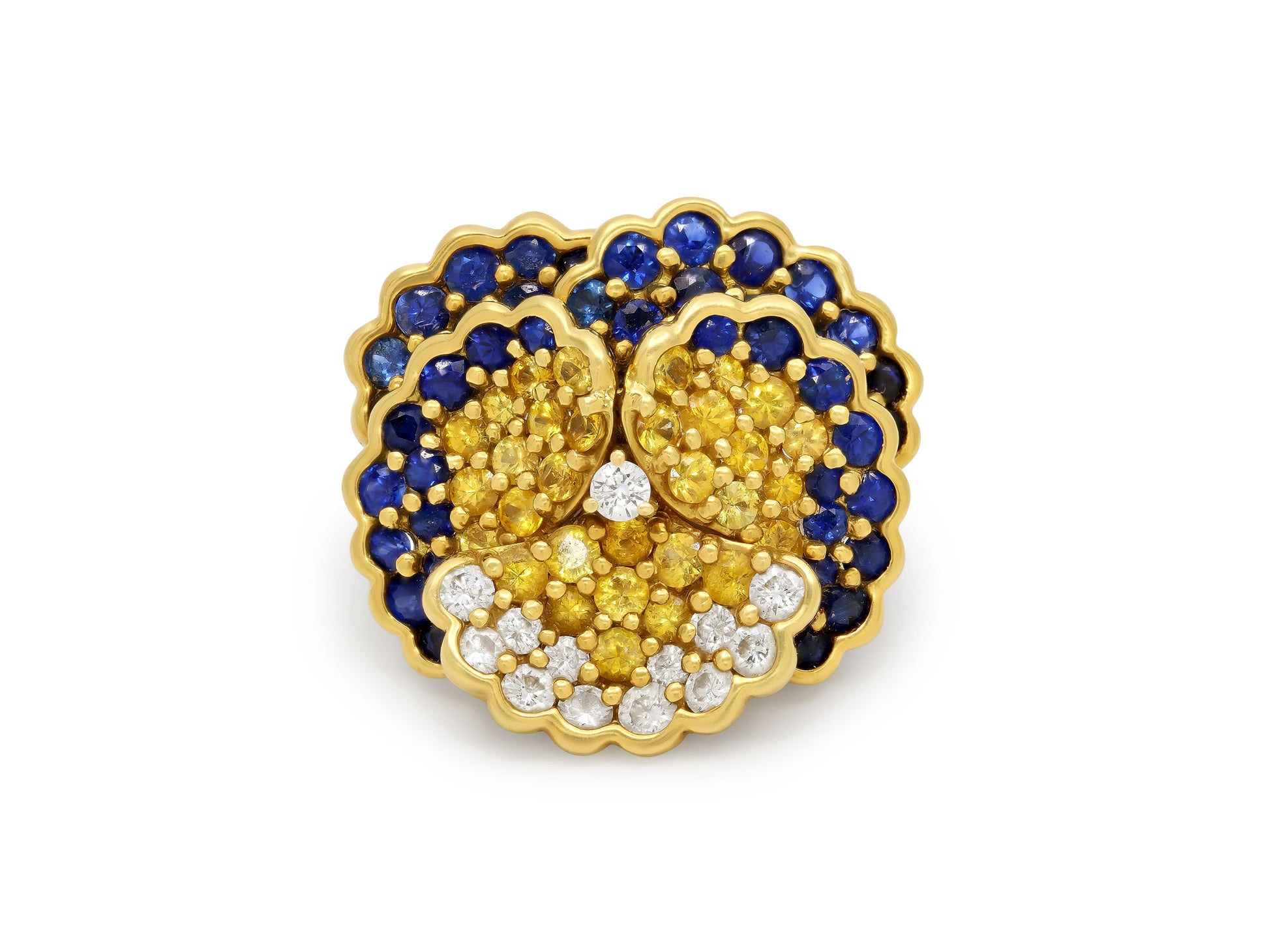 Designed as a pansy flower, the upper petals set with sapphires, above the center prong-set diamond within a surround of yellow sapphires, to the lower petal set with diamonds, in 18k yellow gold. Signed Jean Vitau.