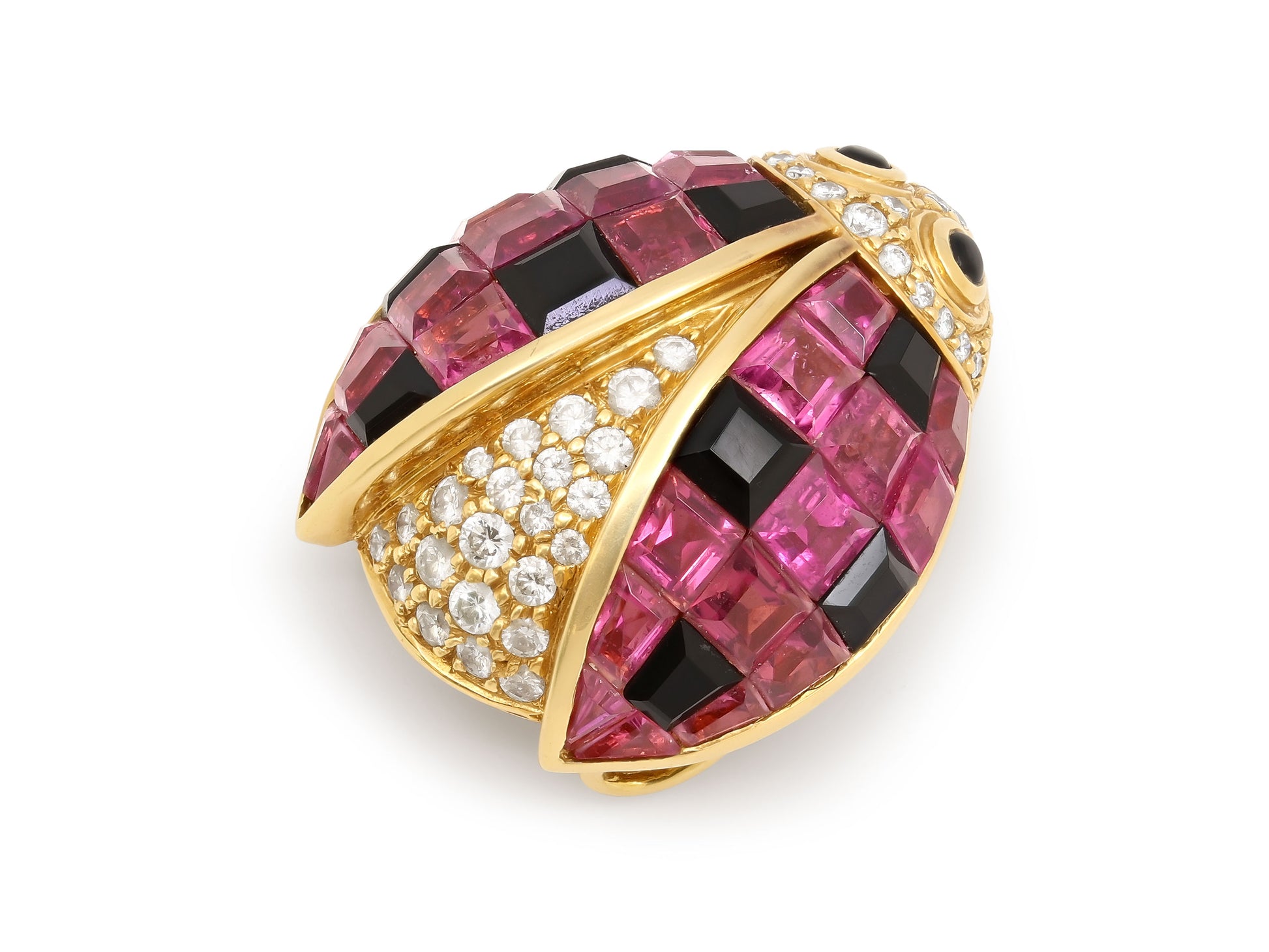 The pin depicting a ladybug, with a diamond pavé body and head, with invisible set pink tourmaline and onyx wings, in high polish 18k gold.