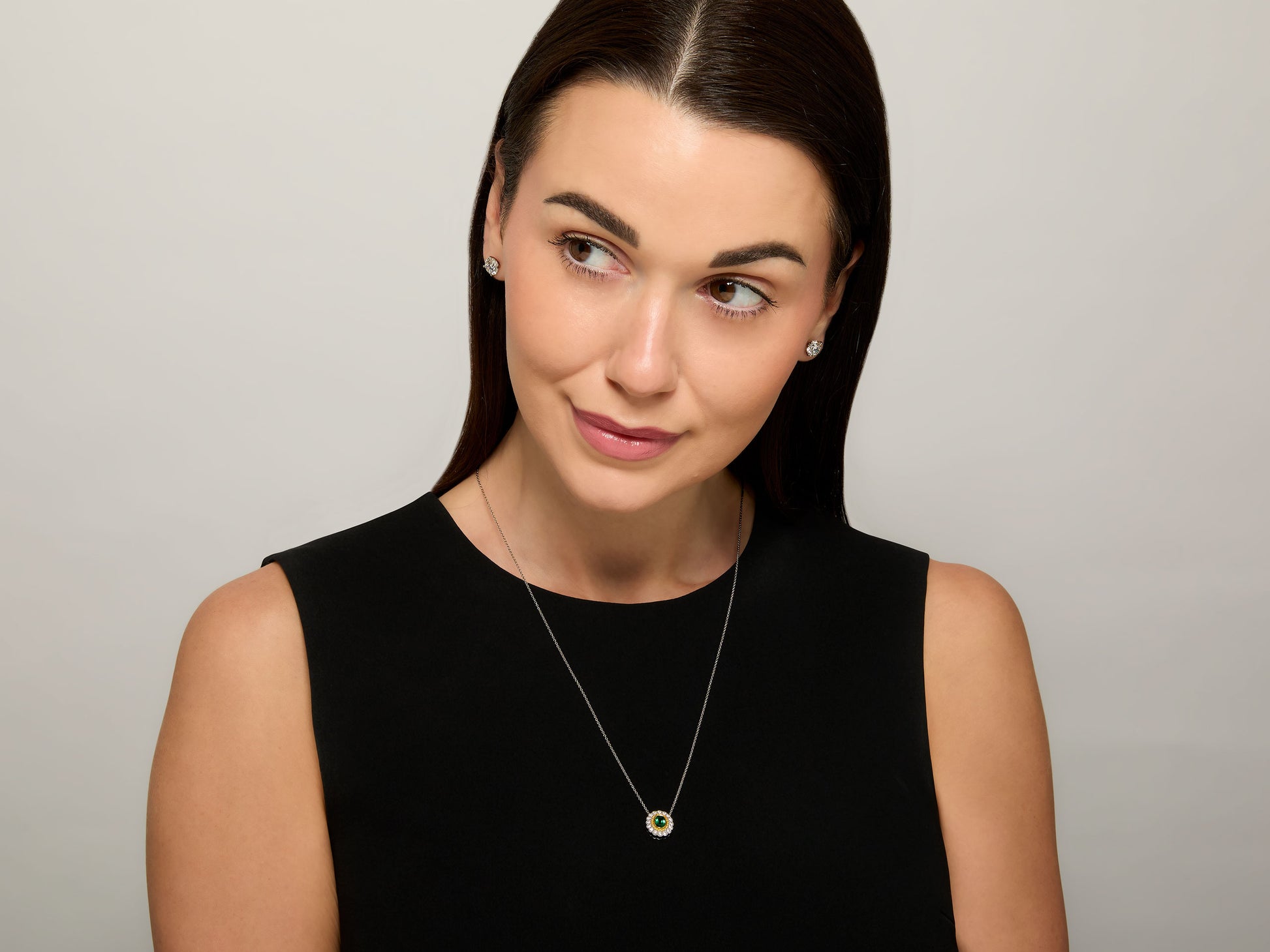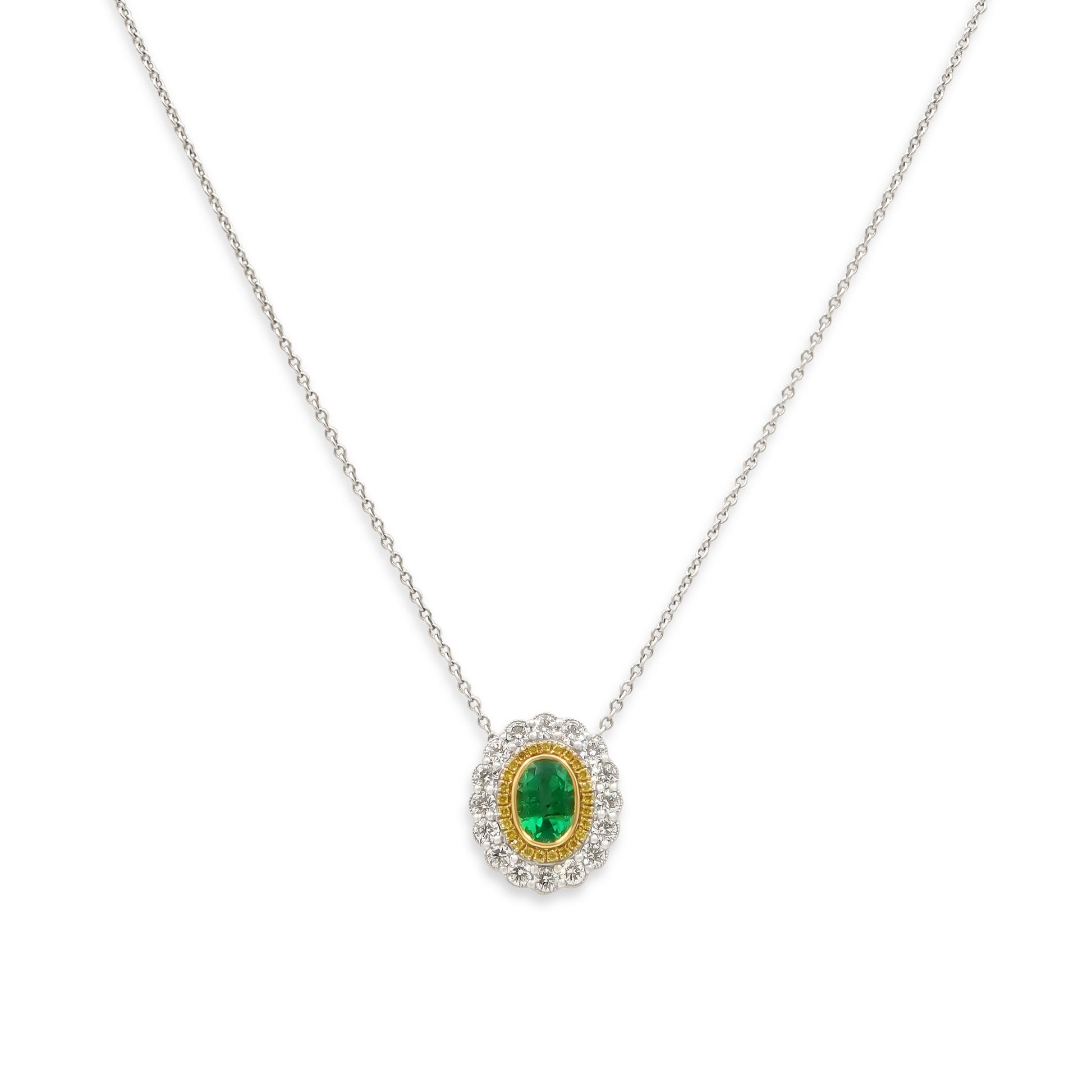 The pendant centering on a bezel-set oval emerald within yellow diamonds set in yellow gold, to the outer halo of diamonds set in white gold, to a white gold fine link chain, all in 18K. Signed Leibish.