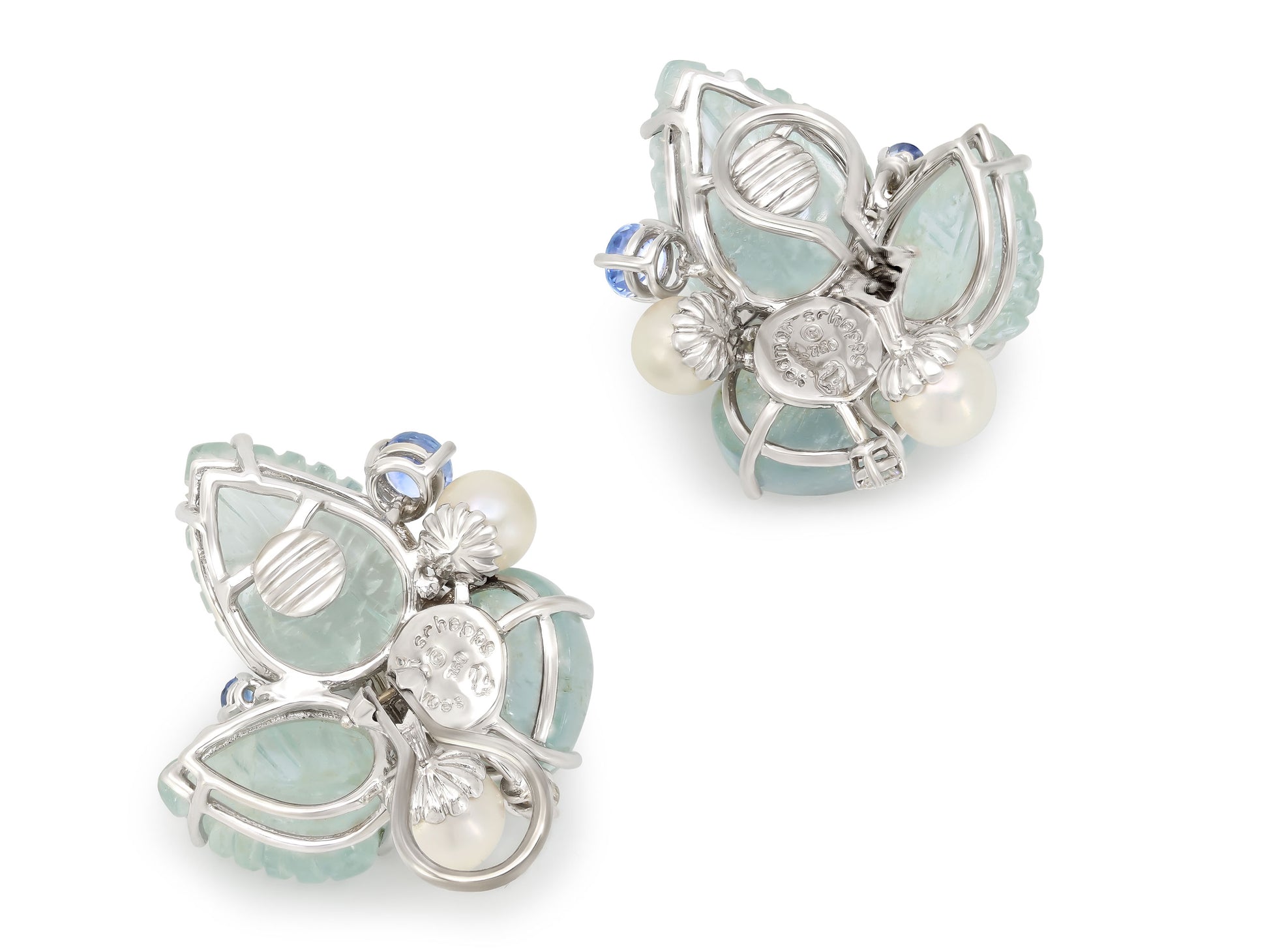Each earring composed of a cluster of two leaf motif carved aquamarines with an oval cabochon aquamarine, surrounded by multi-sized round sapphires, pearls, and round brilliant diamonds, in 18k white gold. Signed Seaman Schepps.