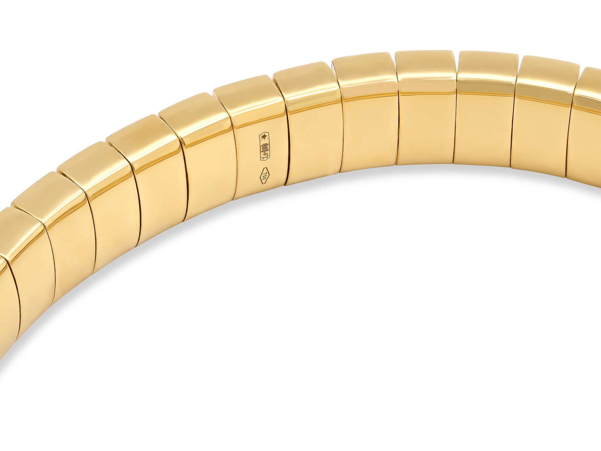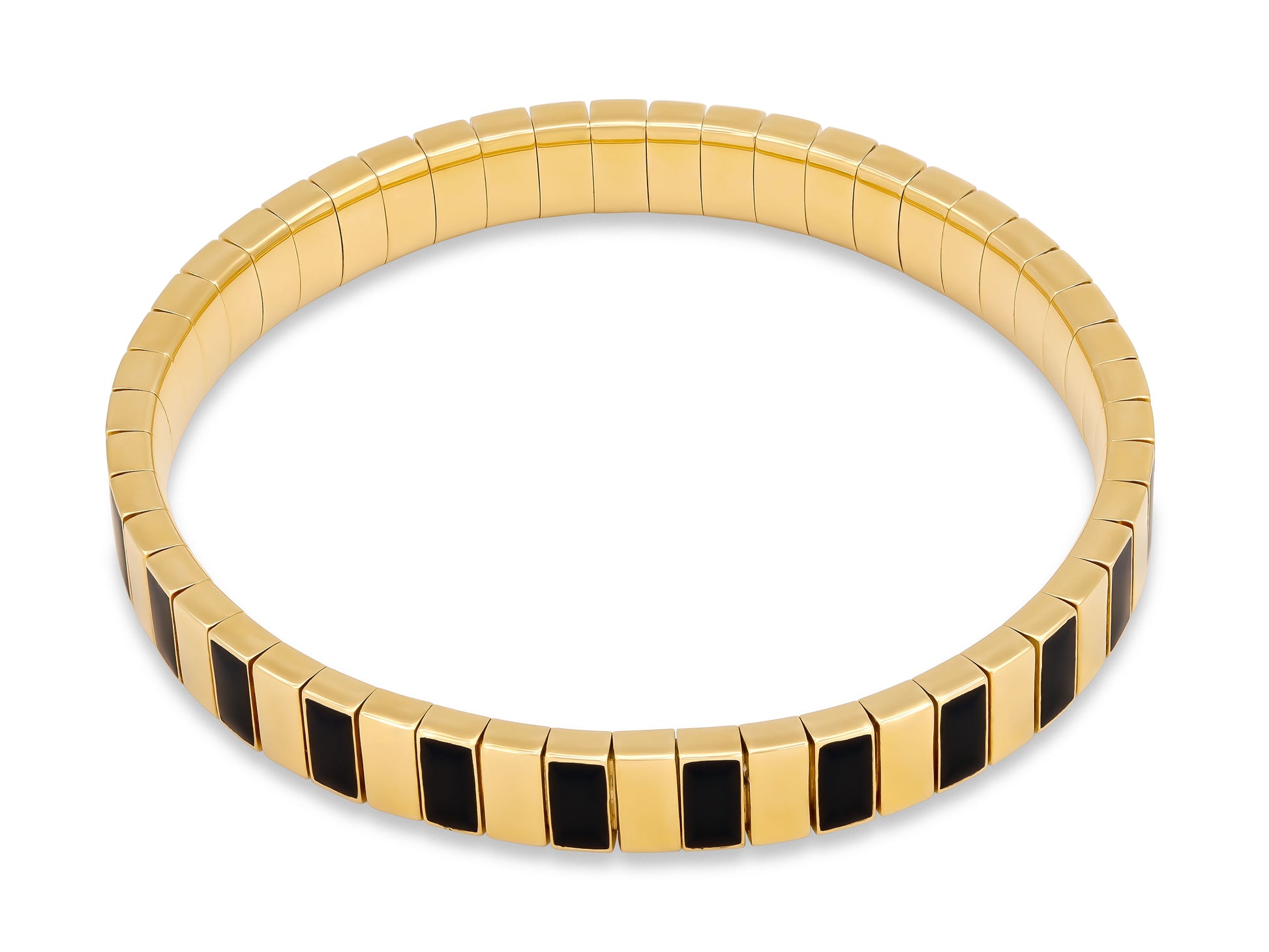 Stretchable bracelet composed of alternating high polish 18k yellow gold panels and panels inlaid with onyx.