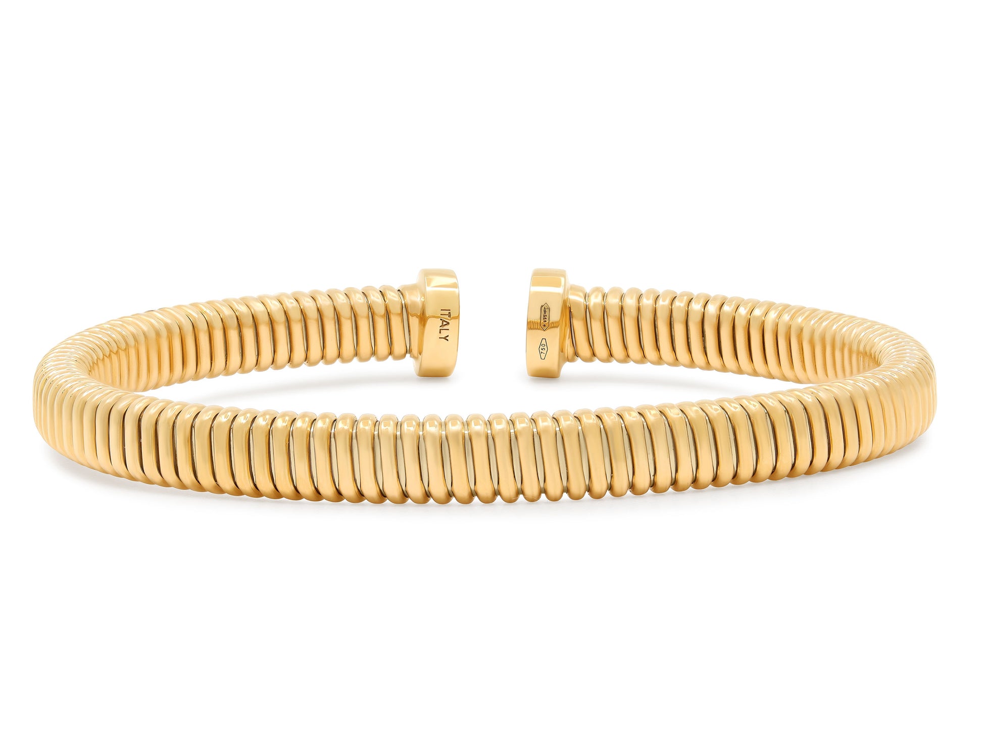 The tubogas bangle with high polish terminals, in 18k yellow gold. Made by hand in Italy, for Beladora.
