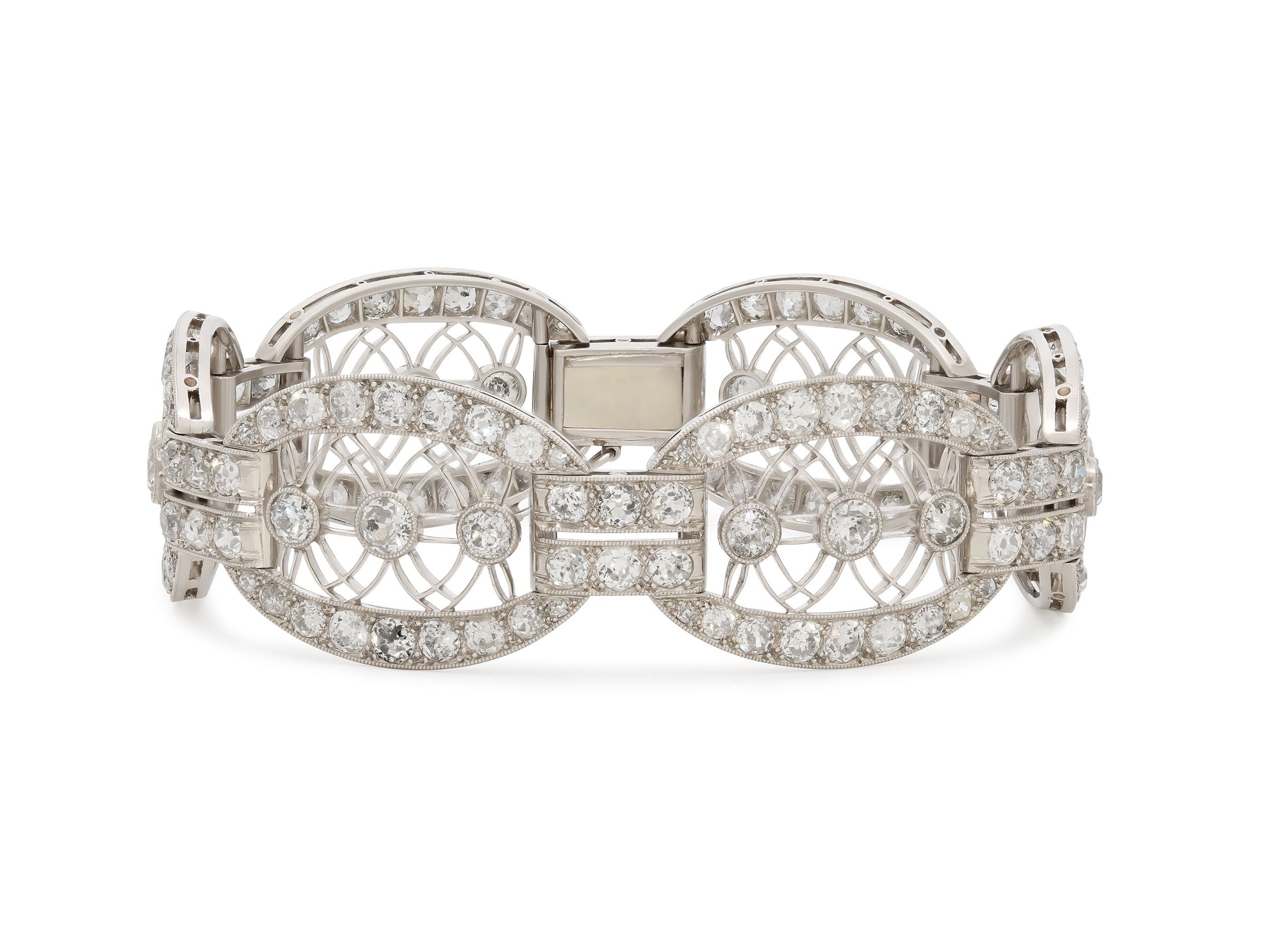 Composed of six filigree openwork oval links, each centering on a trio of bezel-set old mine-cut diamonds, within old mine-cut diamond set borders, connected by smaller rectangular links composed of two rows each set with three diamonds, set in millegrain detailed platinum with an 18k white gold clasp. With French hallmarks.