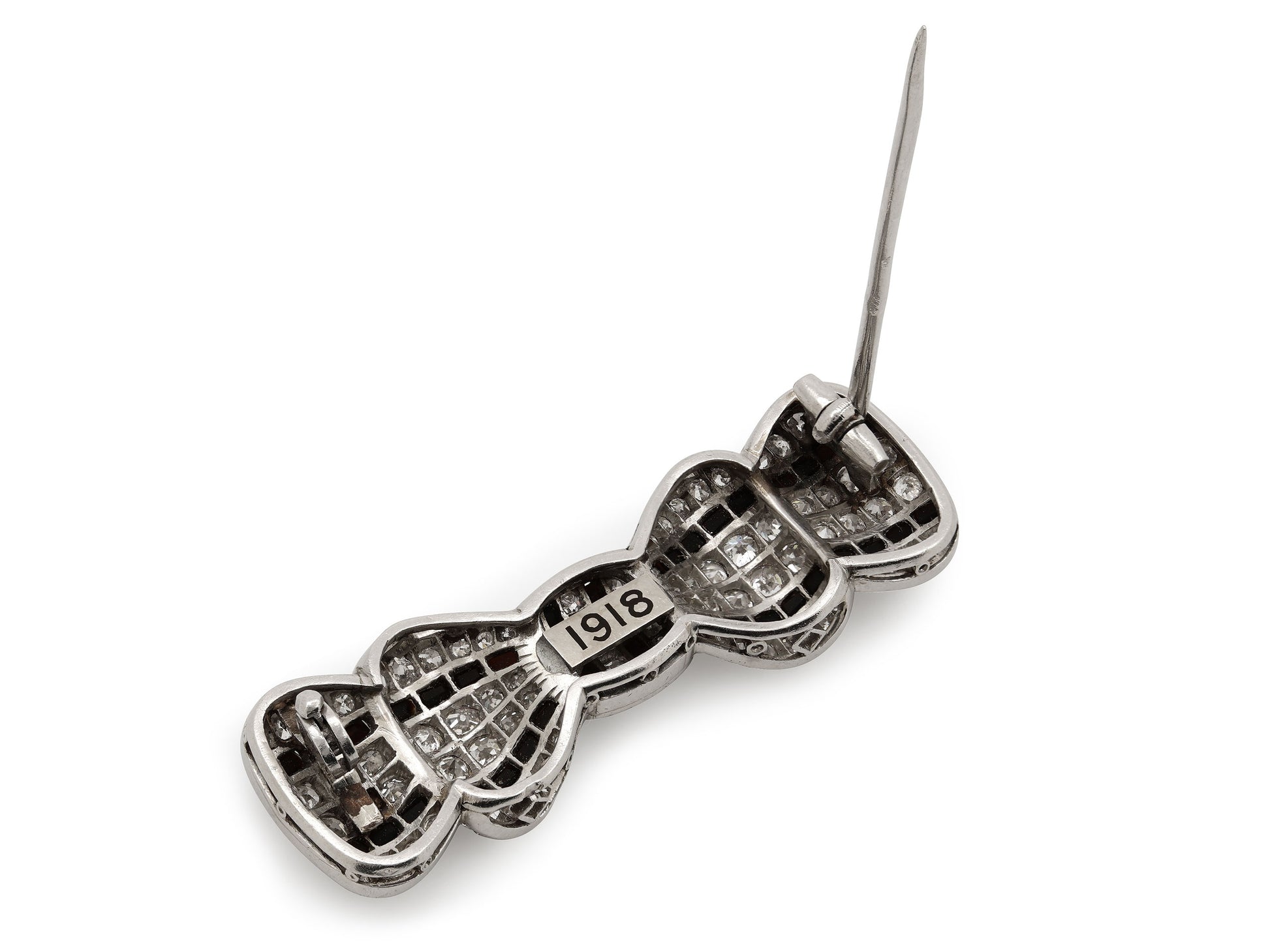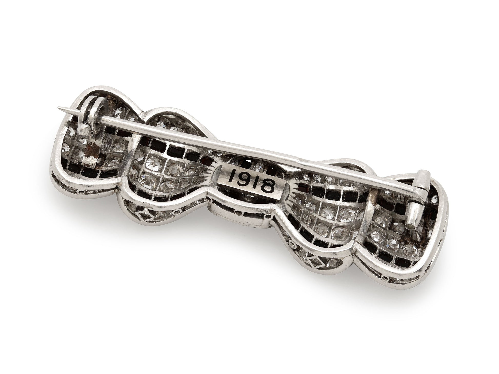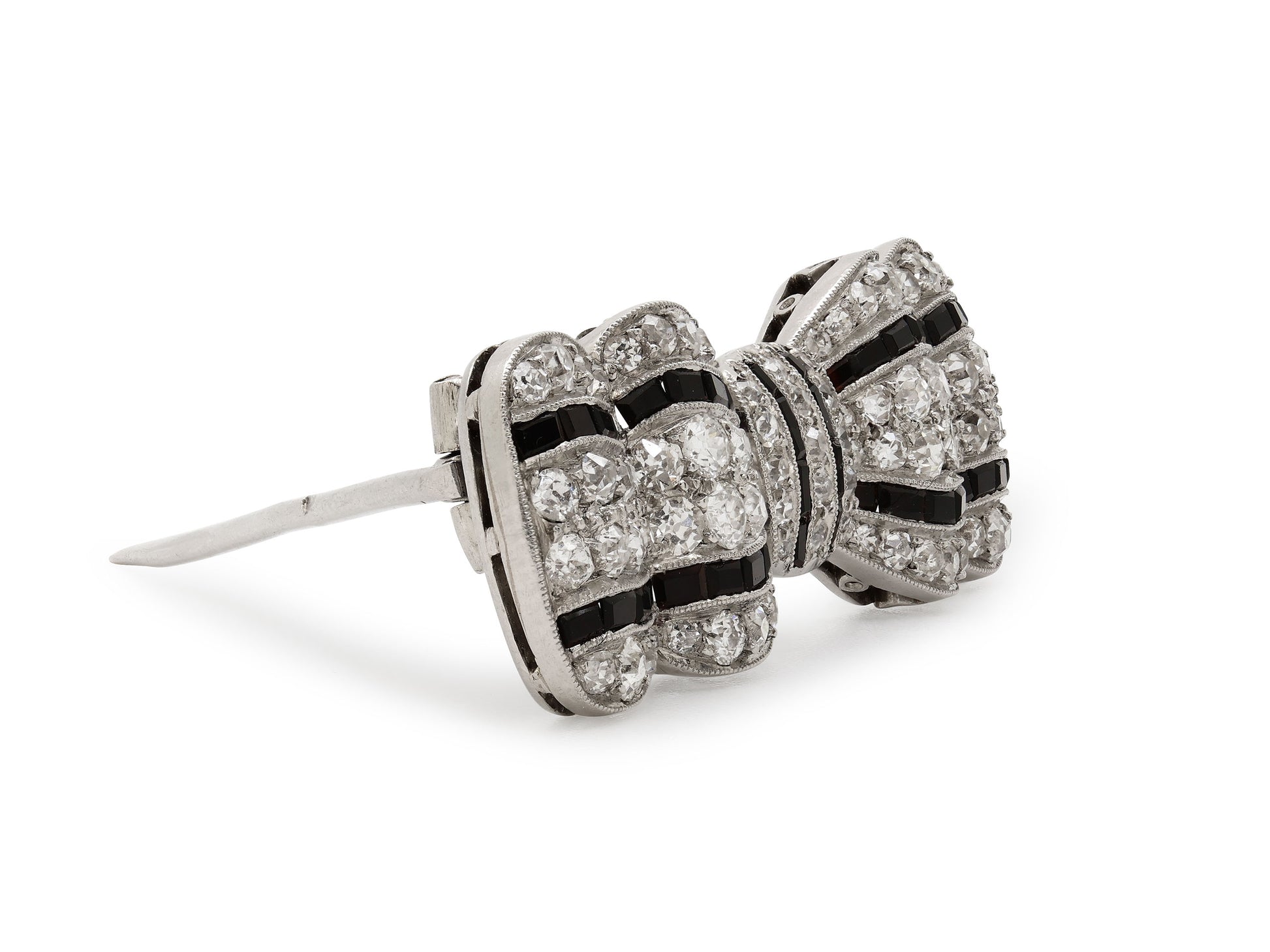 Of bow motif, pavé set with old cut diamonds, including old mine, old European and old single cuts, trisected by stripes of rectangular-cut onyx, with millegrain detailing throughout, in platinum.