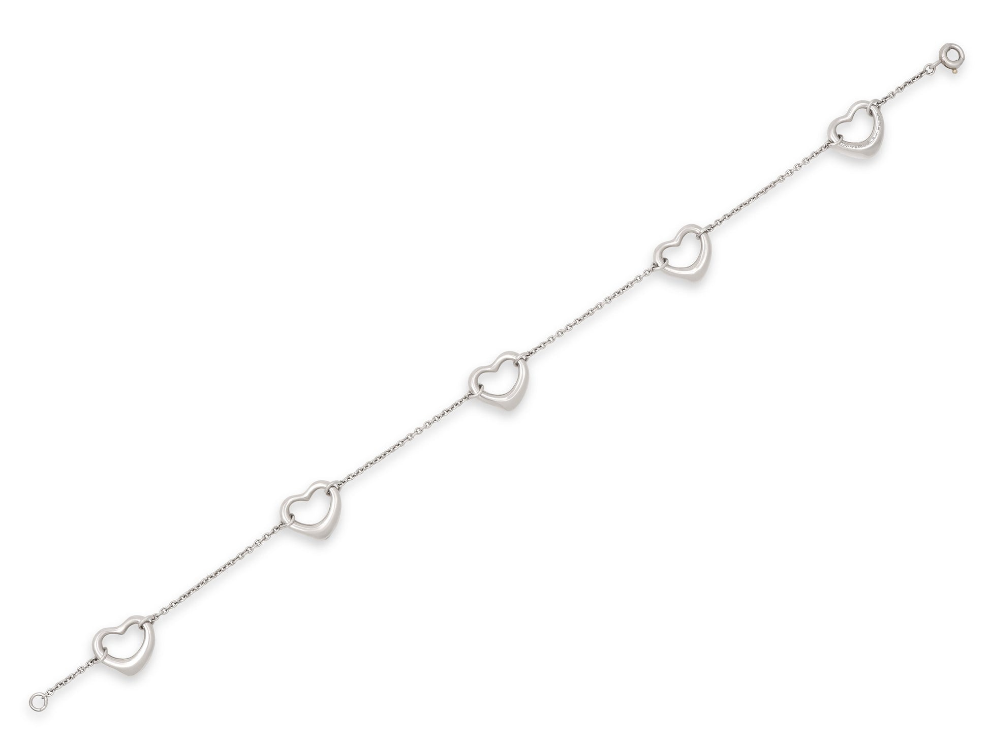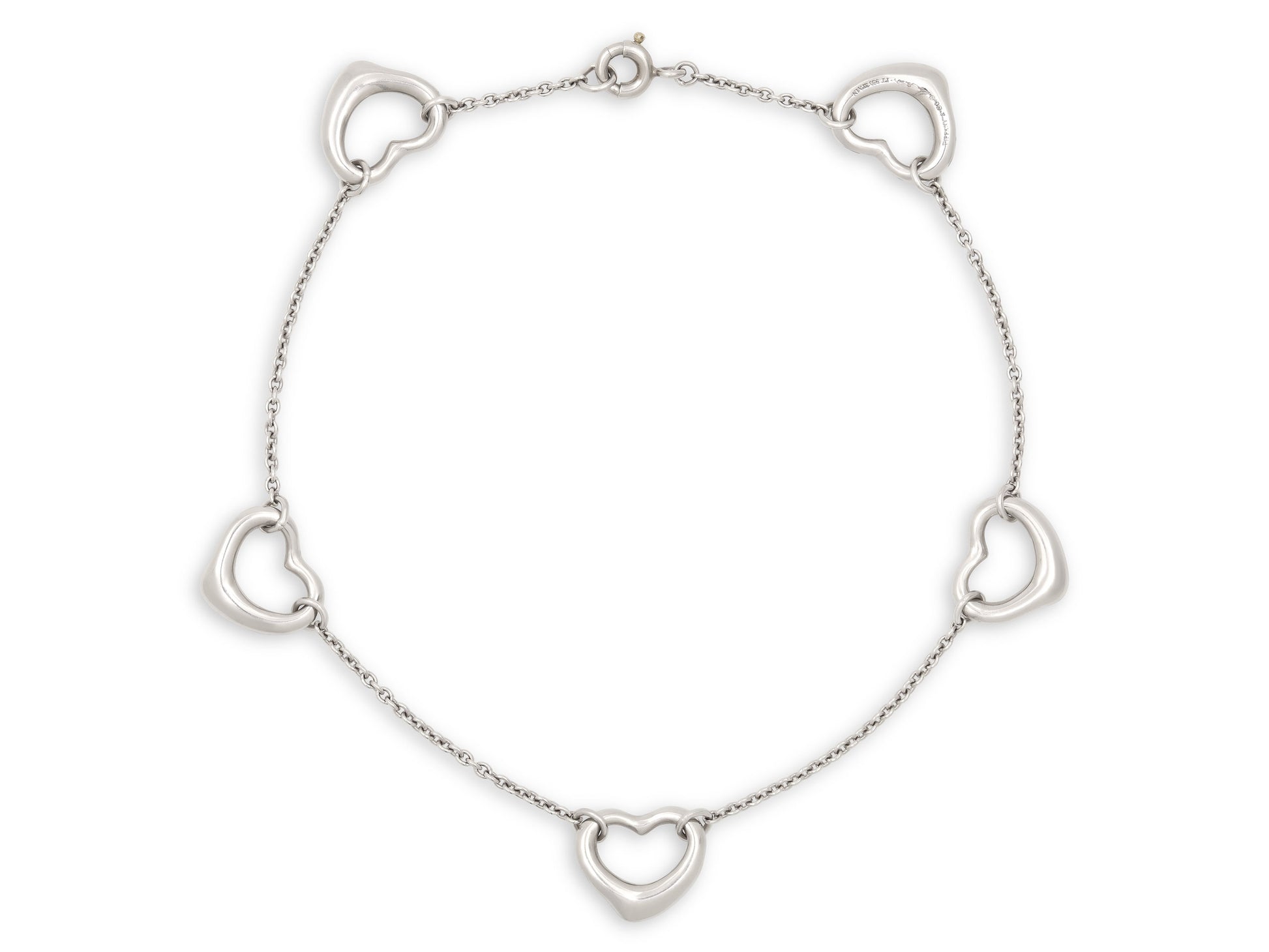 The fine link chain with five open hearts, in platinum. Signed Tiffany & Co. Elsa Peretti, Spain.