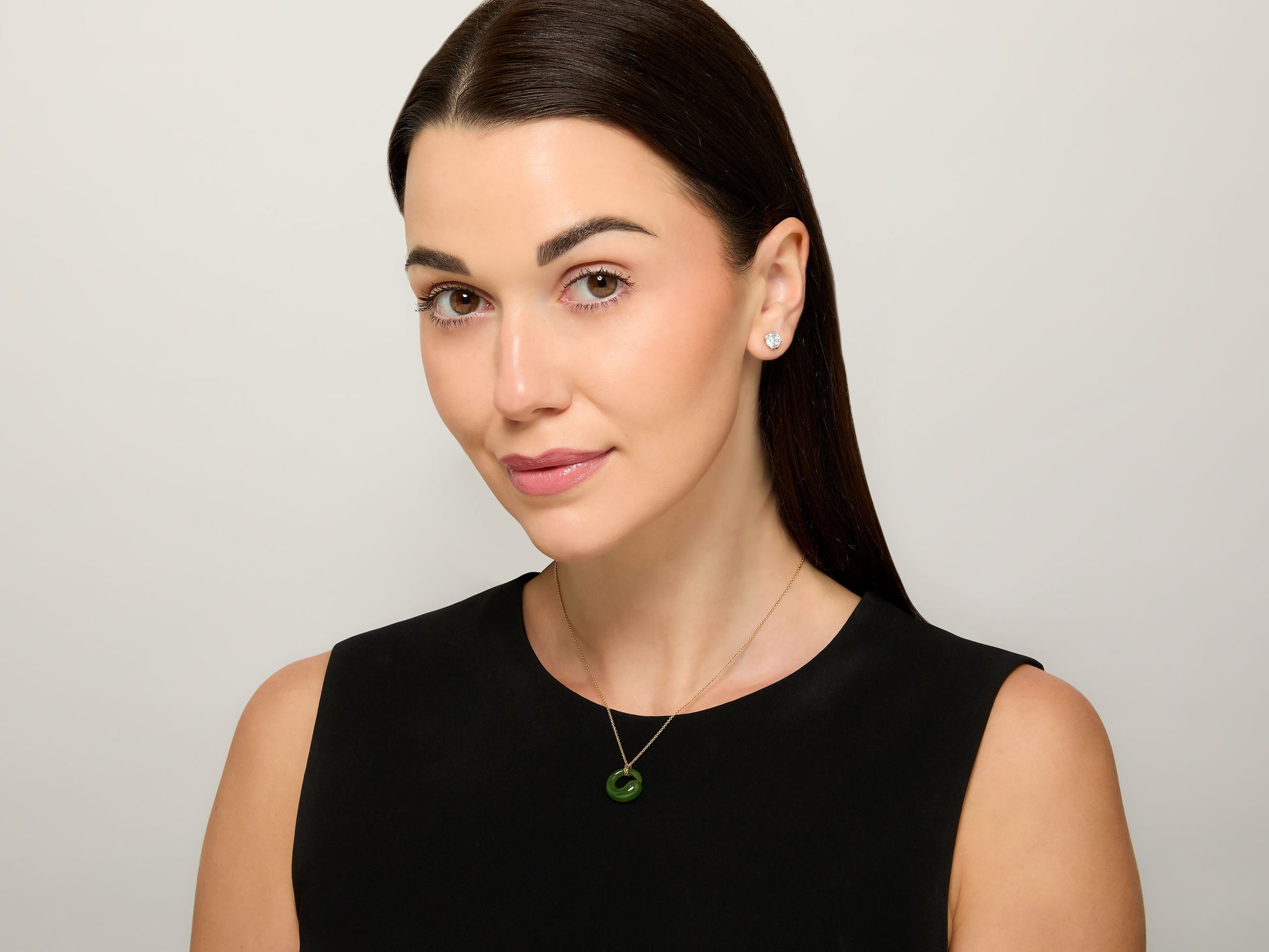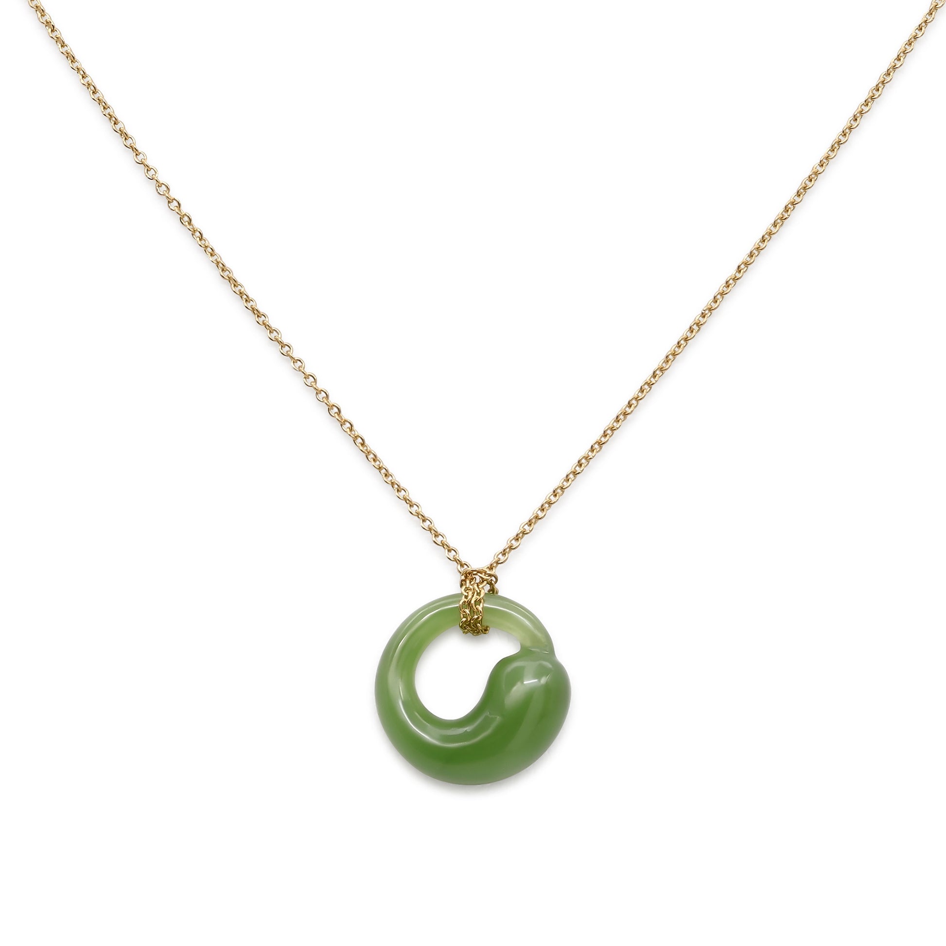 The eternal circle motif in carved jade, suspended from a fine link 18k yellow gold chain. Signed Tiffany & Co. Elsa Peretti.