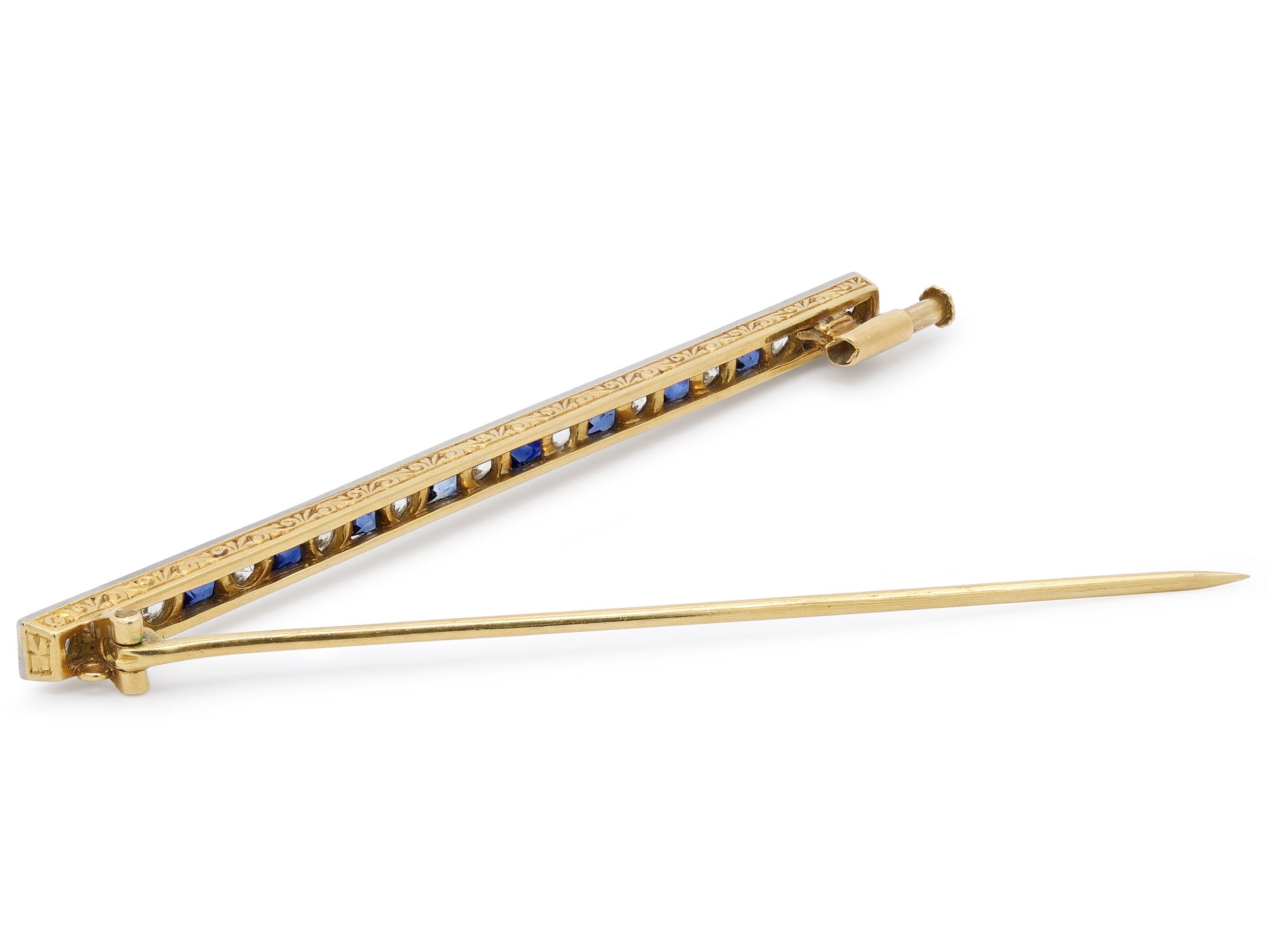 Set with alternating French cut sapphires and old cut diamonds in the platinum top with millegrain detailing, to the engraved 18k yellow gold backing and pin stem.