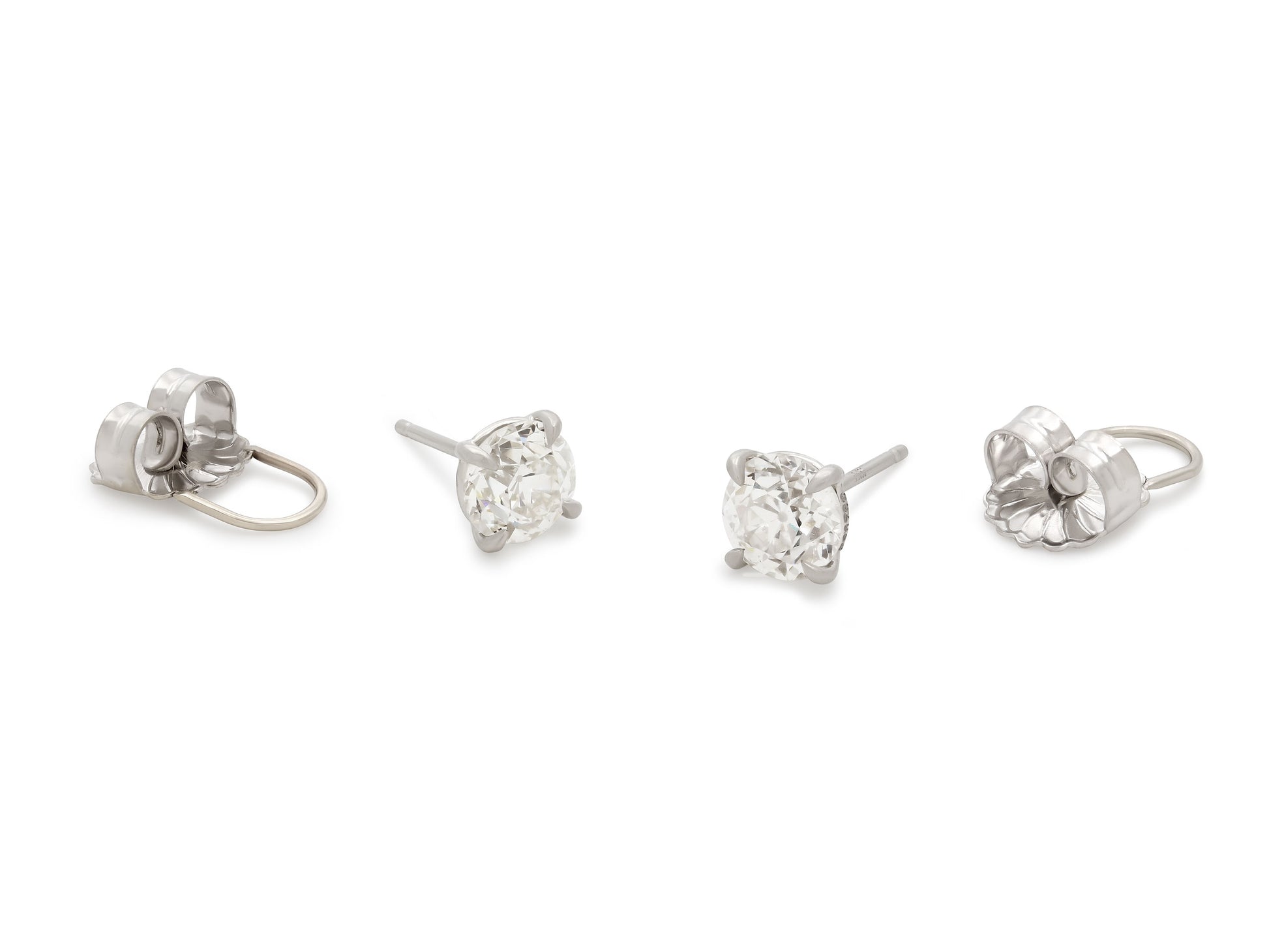 Pair of old European cut diamond studs, weighing 1.68 and 1.57 carats, in a four prong mounting in platinum. With 14k horse-shoe friction backs.