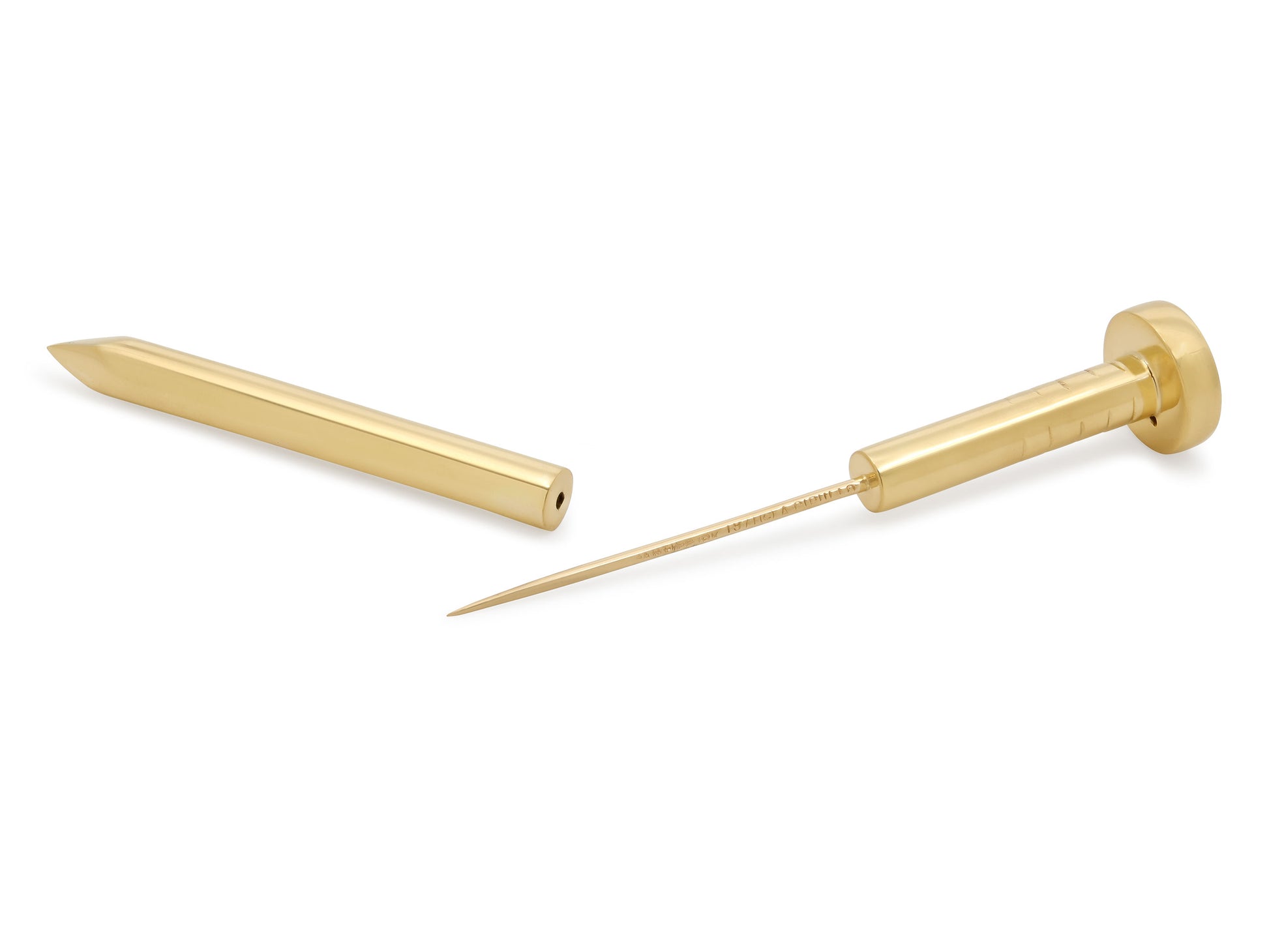 The pin designed as a nail, in high polish 18k yellow gold. Signed Cartier A. Cipullo.