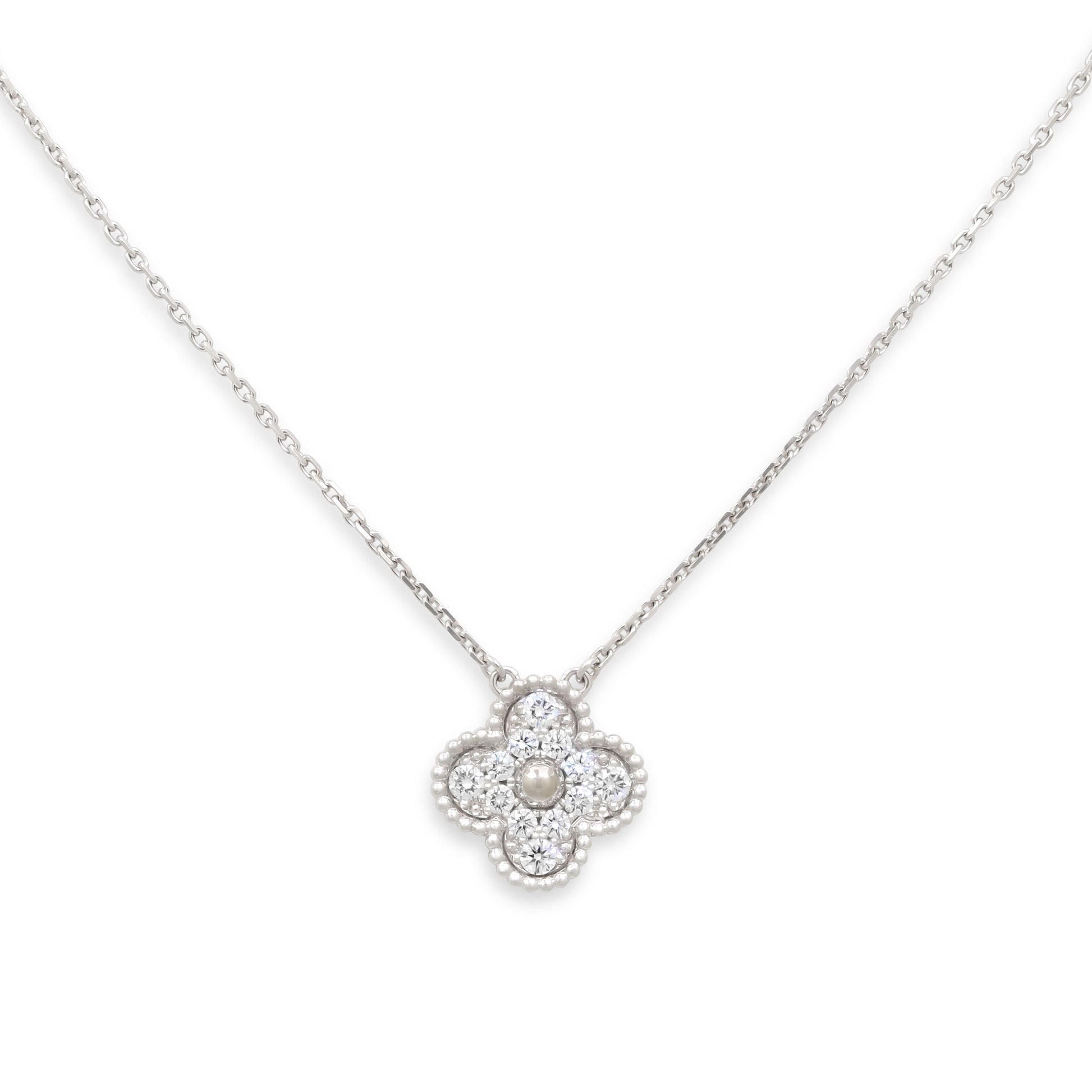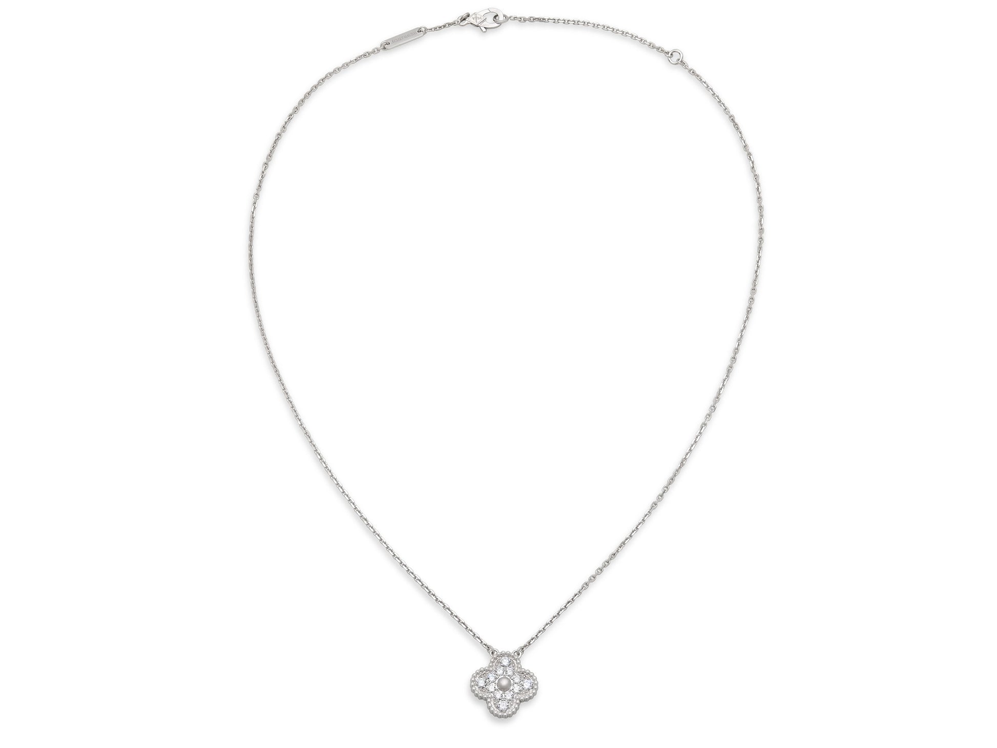 The 18k white gold chain suspending a pavé diamond Alhambra motif. Signed VCA for Van Cleef & Arpels. Includes manufacturer's box and paperwork.