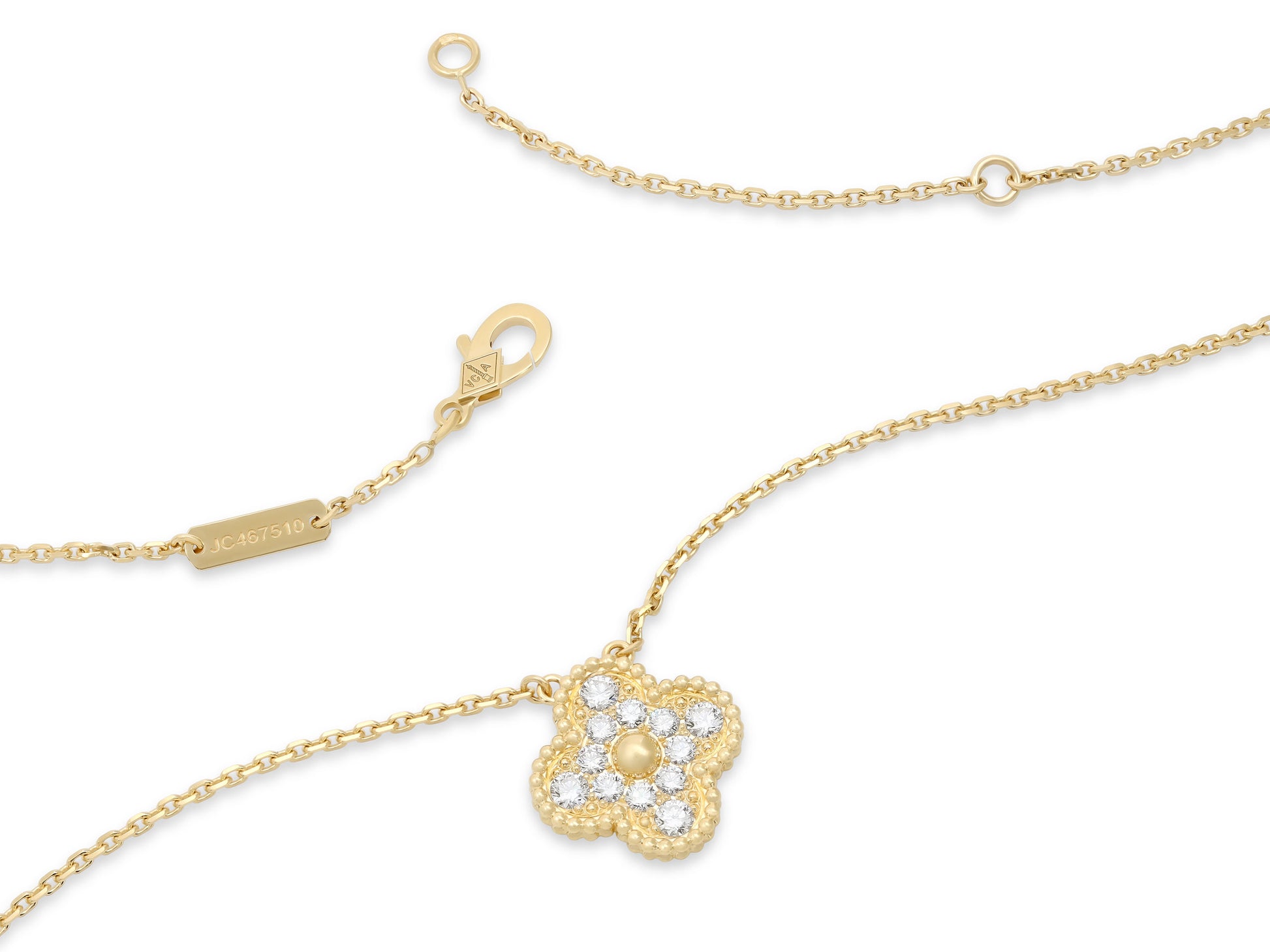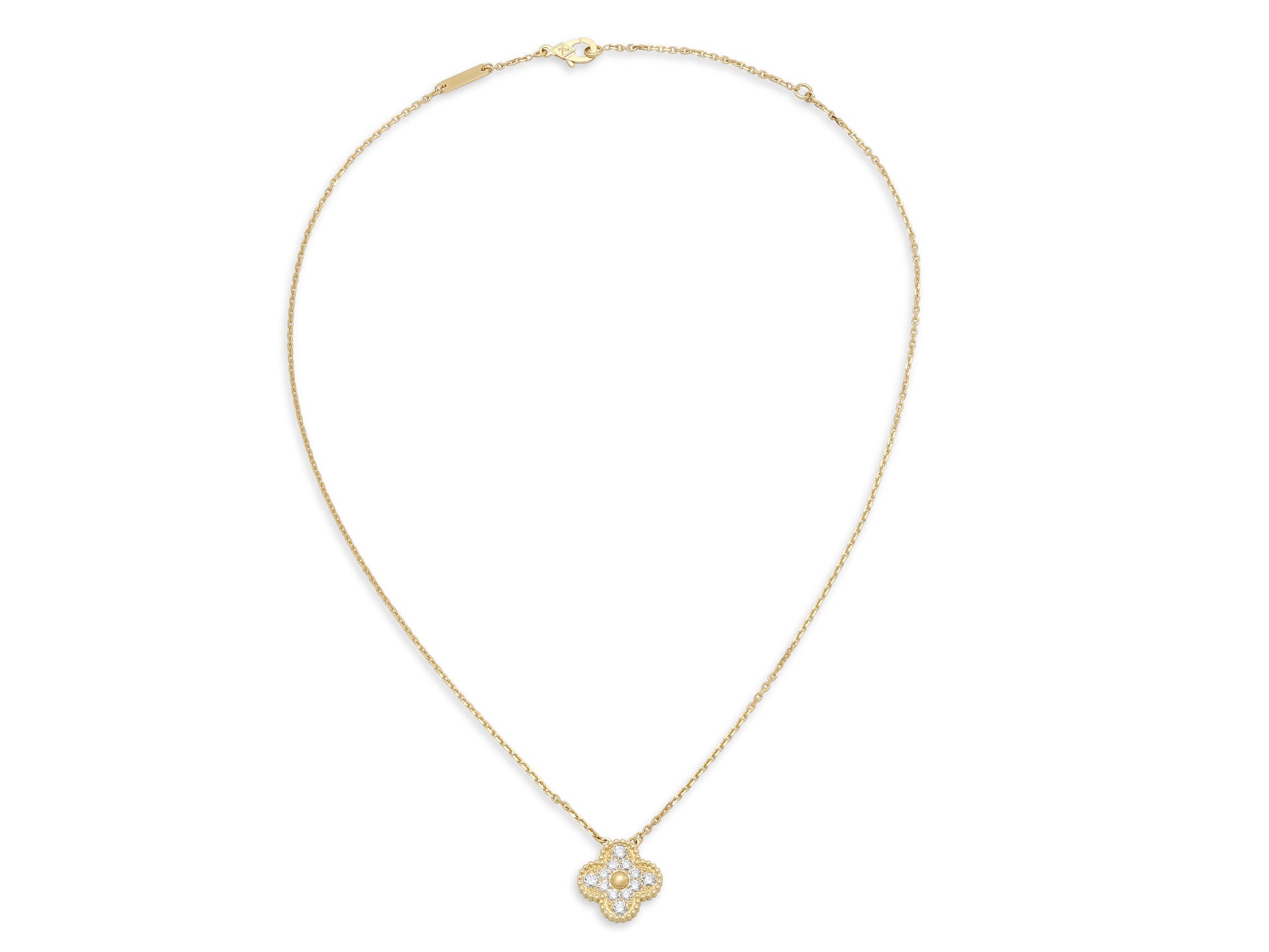 The 18k yellow gold chain suspending a pavé diamond Alhambra motif. Signed VCA for Van Cleef & Arpels. Includes manufacturer's box and paperwork.