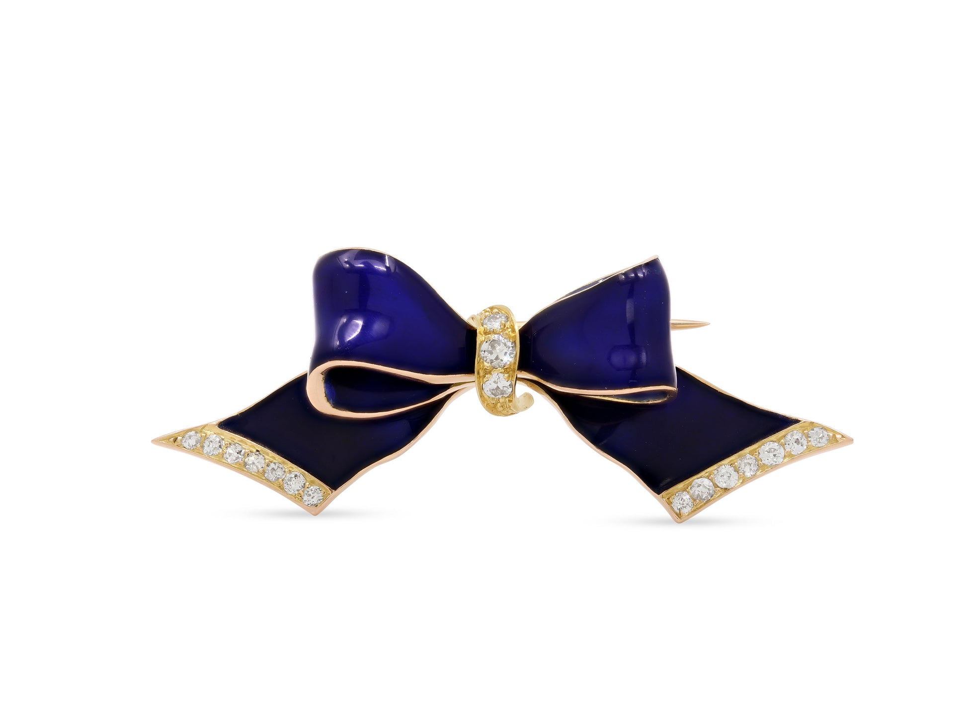 The blue enamel bow motif with a trio of old round cut diamonds and old mine cut diamond ribbon ends, in 14k yellow gold.