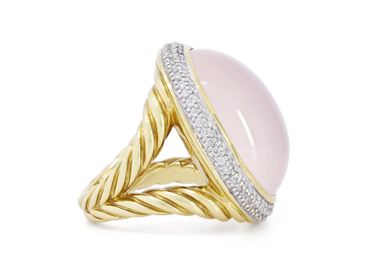 The large cabochon rose quartz, set within a double row diamond halo, with a split shank featuring the iconic David Yurman cable motif, in 18k yellow gold. With David Yurman hallmarks.