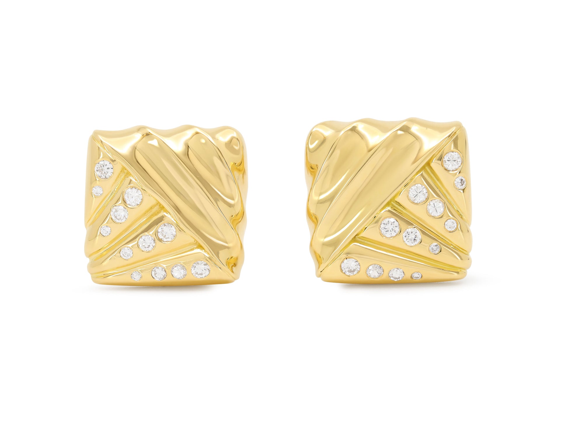 Pair of cushion-shaped earrings with a high polished, fluted pattern, and twelve round brilliant diamonds decorating each. Signed Cartier, with posts and omega backs.