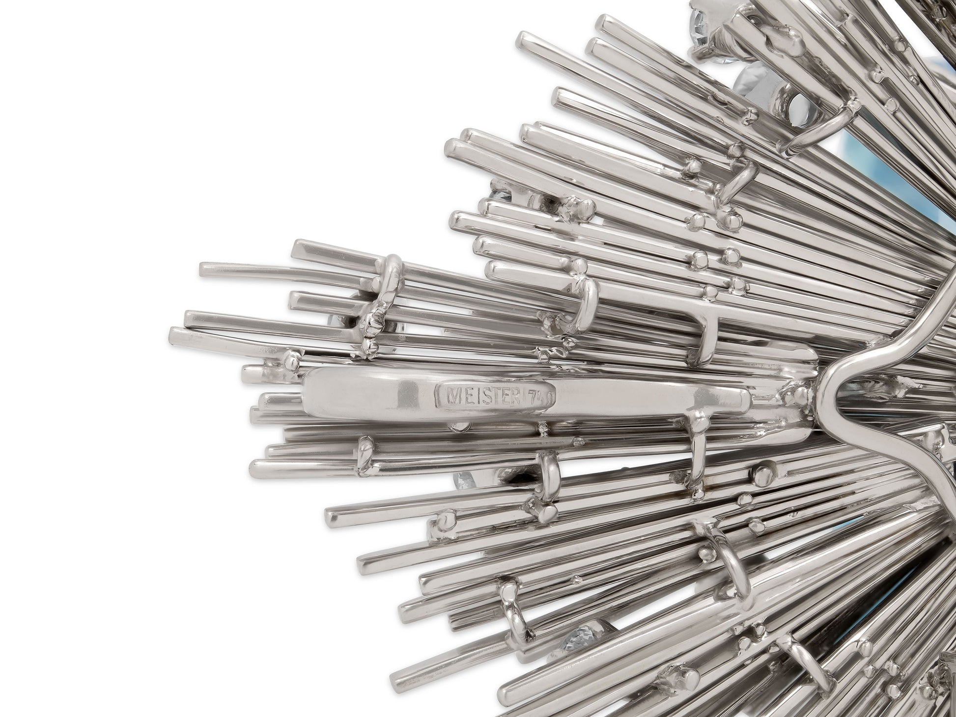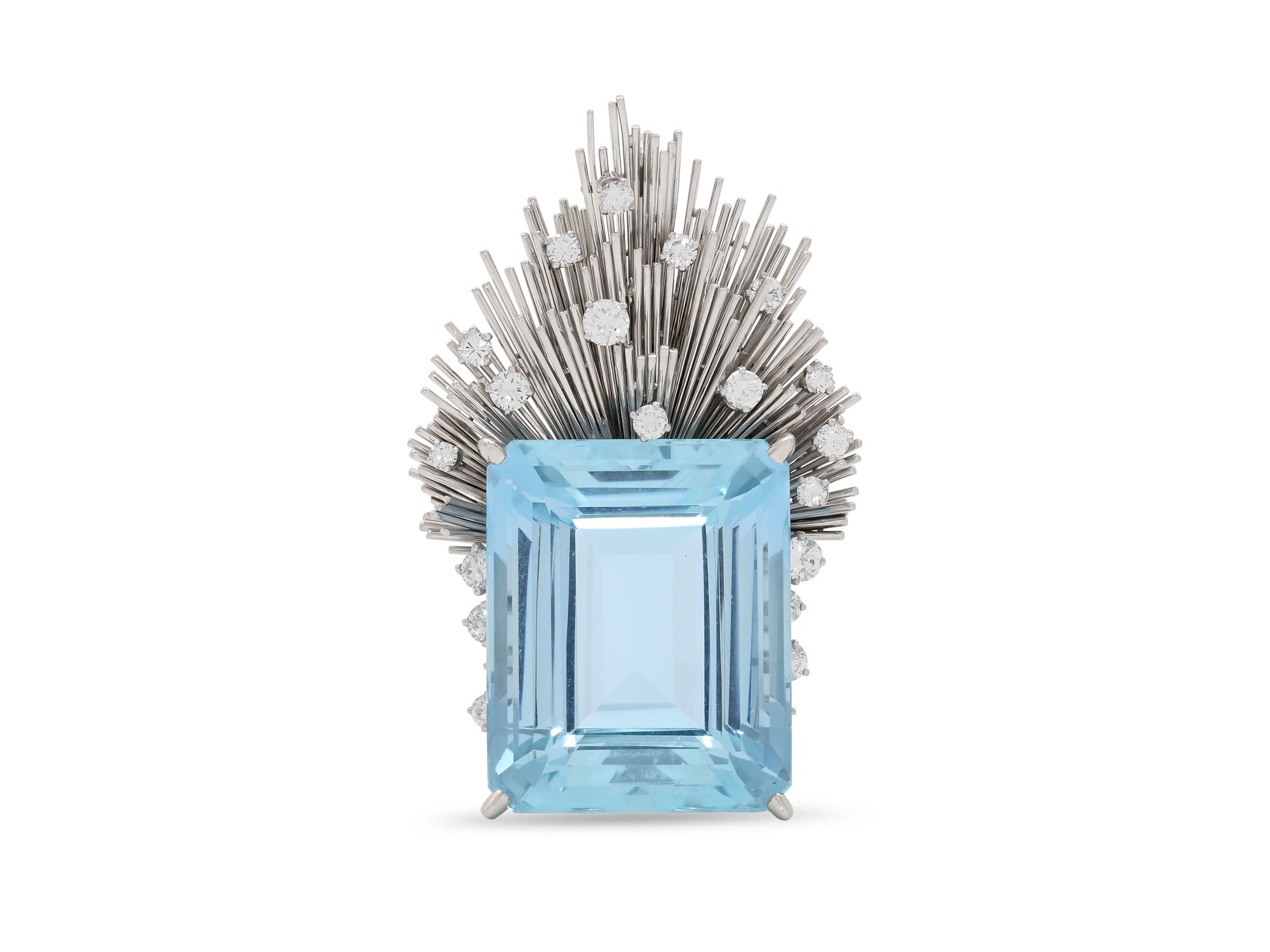 The octagonal step-cut aquamarine, weighing 62.29 carats, in a four prong setting flanked by diamonds, to the spray of high polish gold bars, set throughout with prong-set round diamonds. Set in 18k white gold, signed Meister.