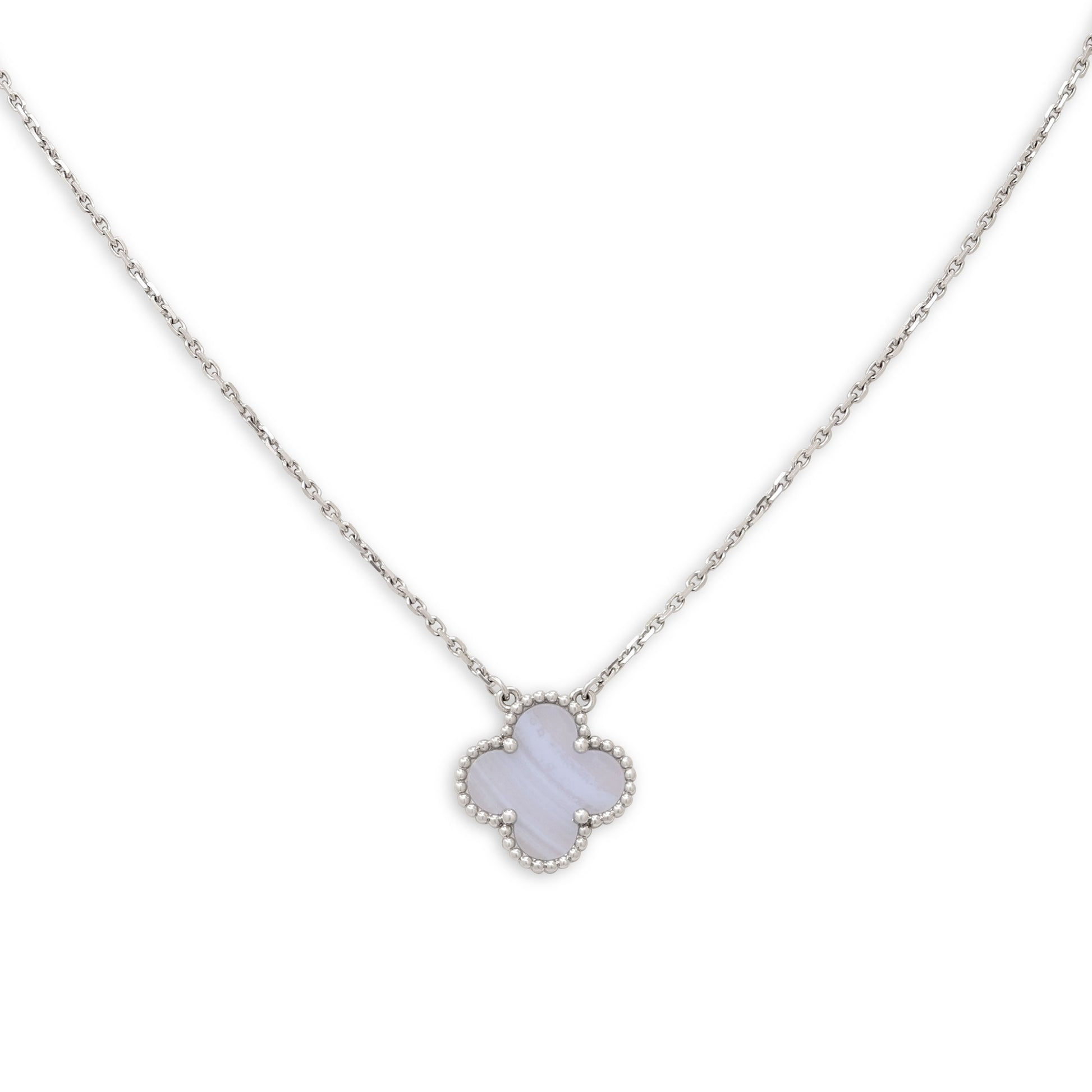 The 18k white gold chain suspending a chalcedony Alhambra motif. Signed VCA for Van Cleef & Arpels, with French hallmarks. Includes manufacturer's box and paperwork.