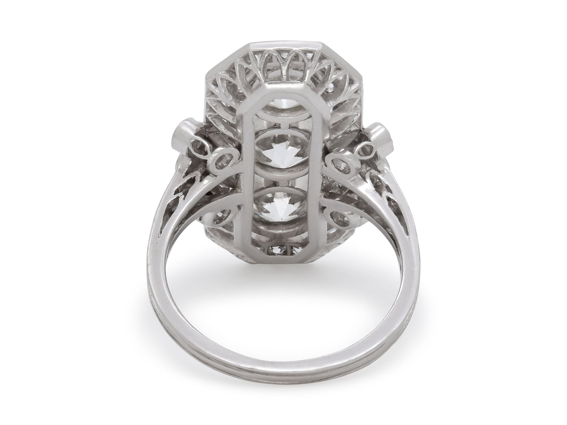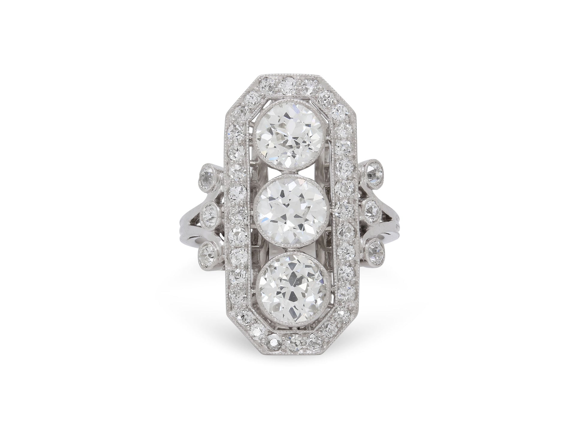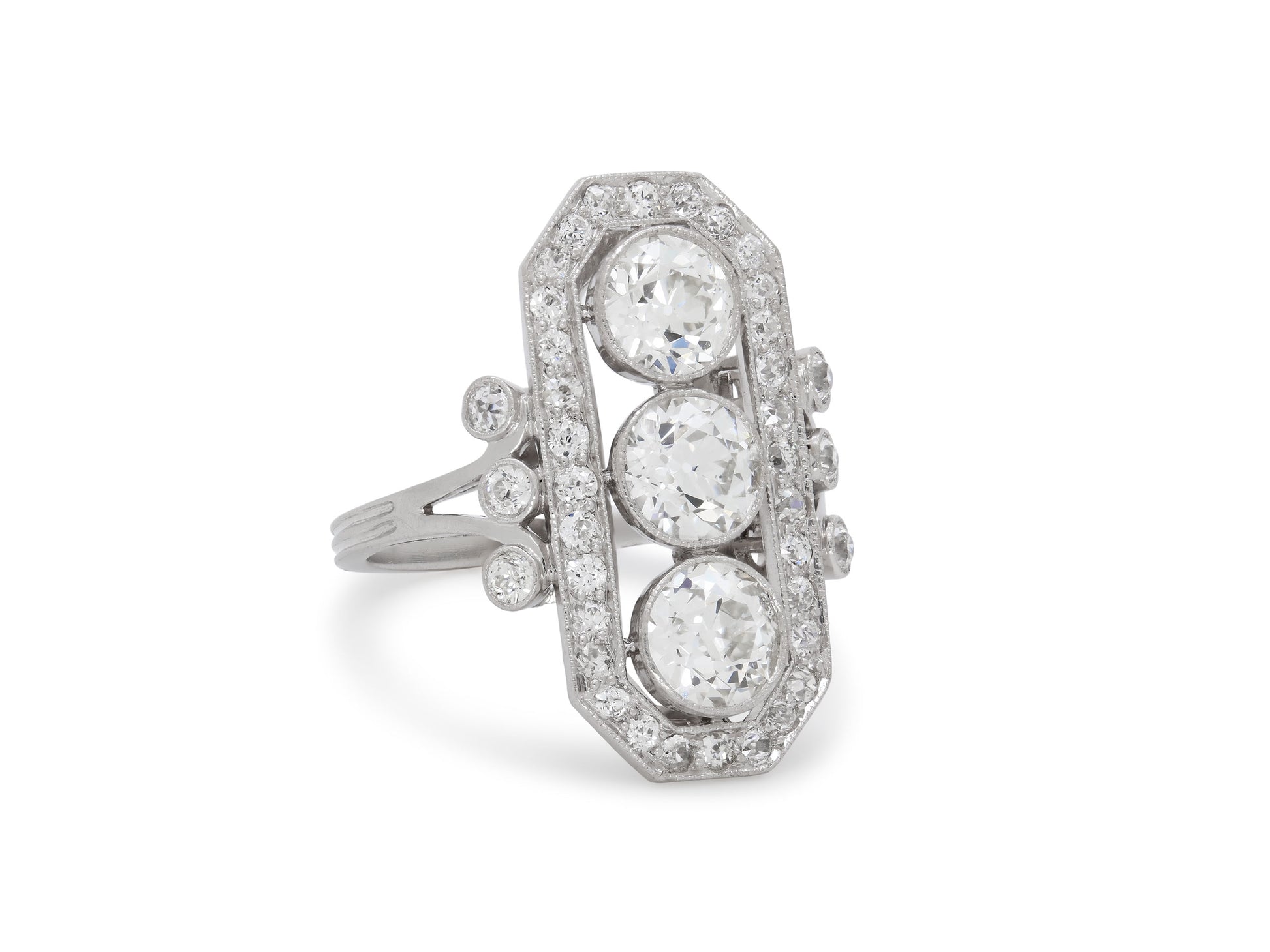 The elongated ring top centering on a trio of old European-cut diamonds, within an openwork frame of diamonds, flanked by bezel-set diamond trio shoulders. Set in platinum with millegrain detailing throughout.
