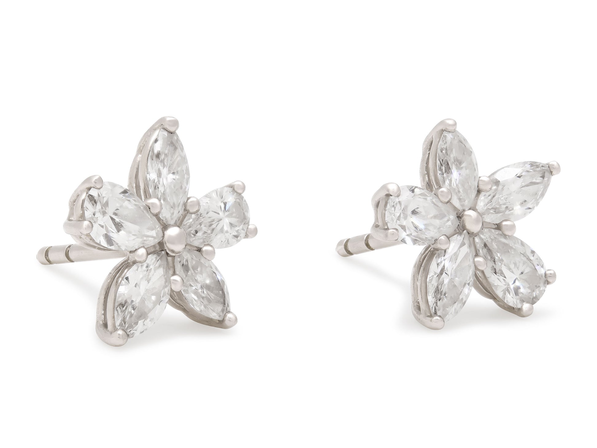 Each flower motif earring composed of alternating pear-shape and marquise-cut diamond petals, in platinum. Signed T & Co., with 14k white gold unsigned backs. Includes manufacturer's box.
