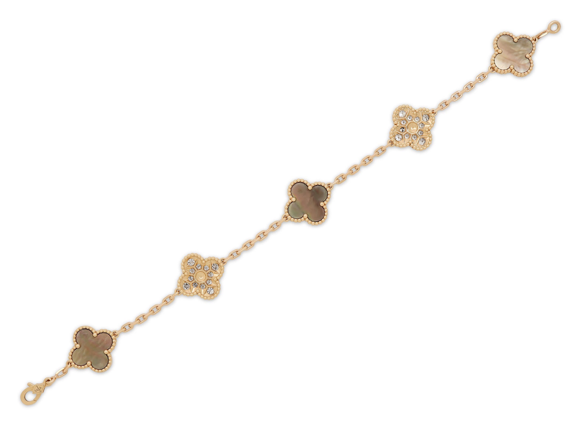 Van Cleef & Arpels 'Vintage Alhambra' Diamond and Mother-Of-Pearl Bracelet, 5 Motifs, in 18K Rose Gold