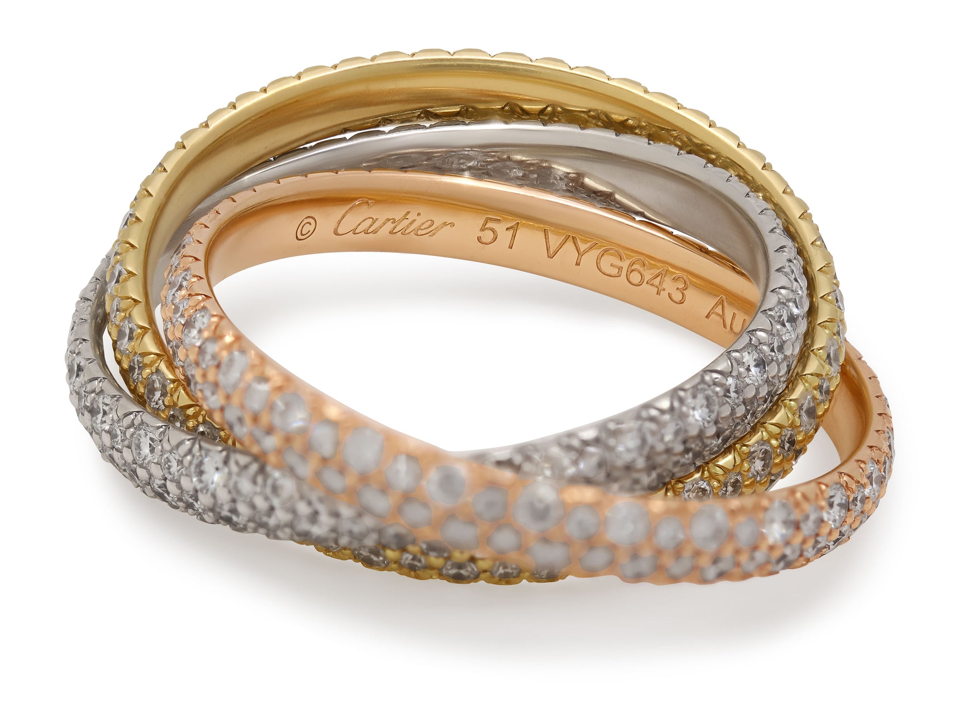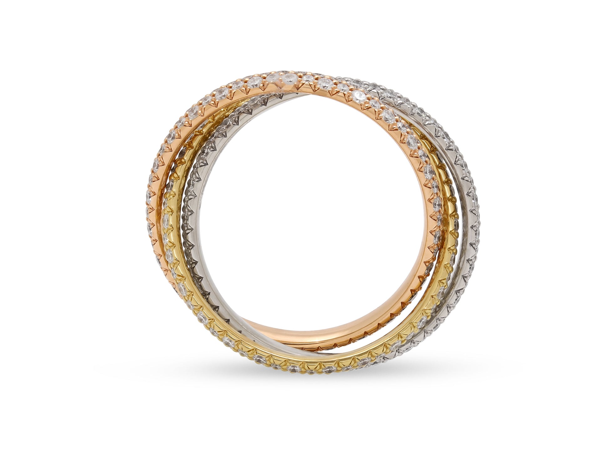 Composed of three interlocking pavé diamond bands, in 18k yellow, white and rose gold. Signed Cartier. Includes manufacturer's box and paperwork.