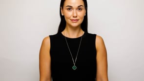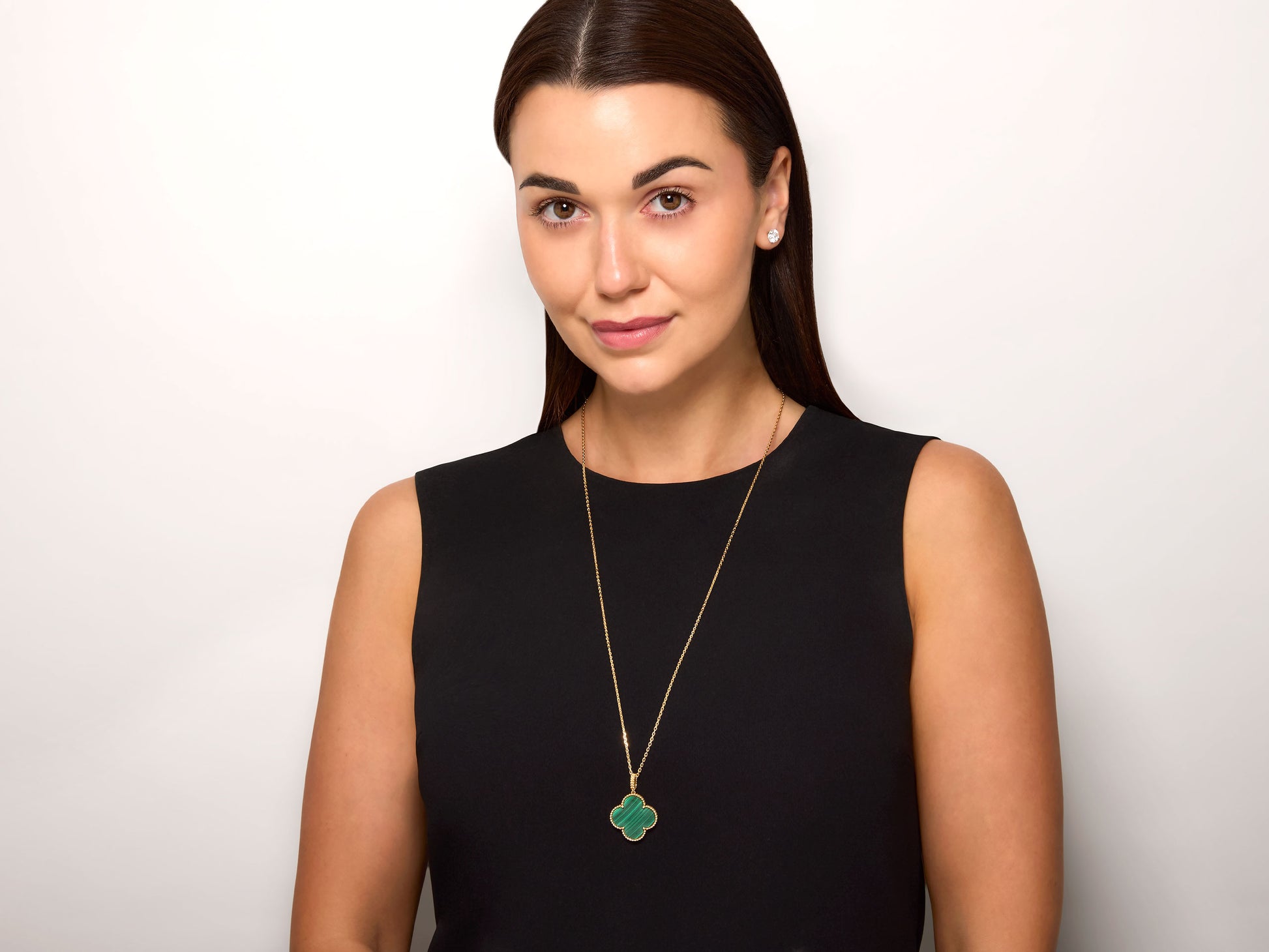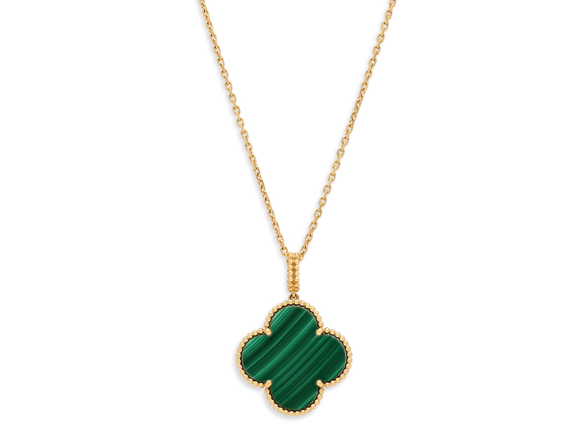 The Alhambra malachite clover pendant suspended from a long cable link chain, in 18k yellow gold. Signed VCA for Van Cleef & Arpels. Includes manufacturer's box and paperwork.