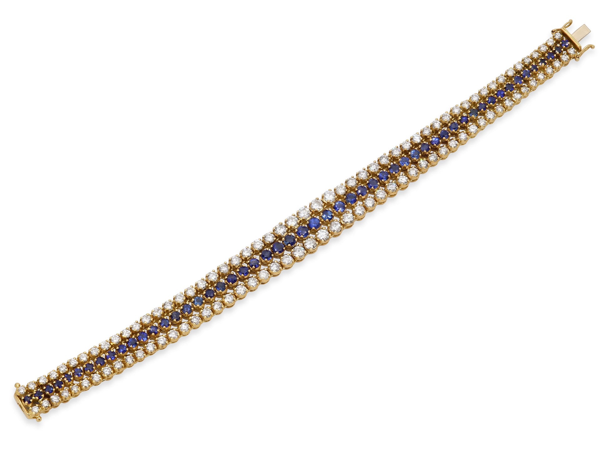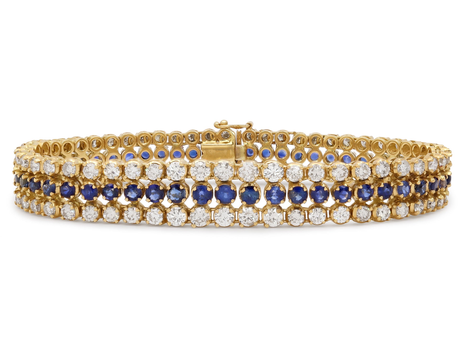 A graduating line of prong-set round sapphires, between two graduating lines of prong-set round brilliant diamonds, in 18k yellow gold.
