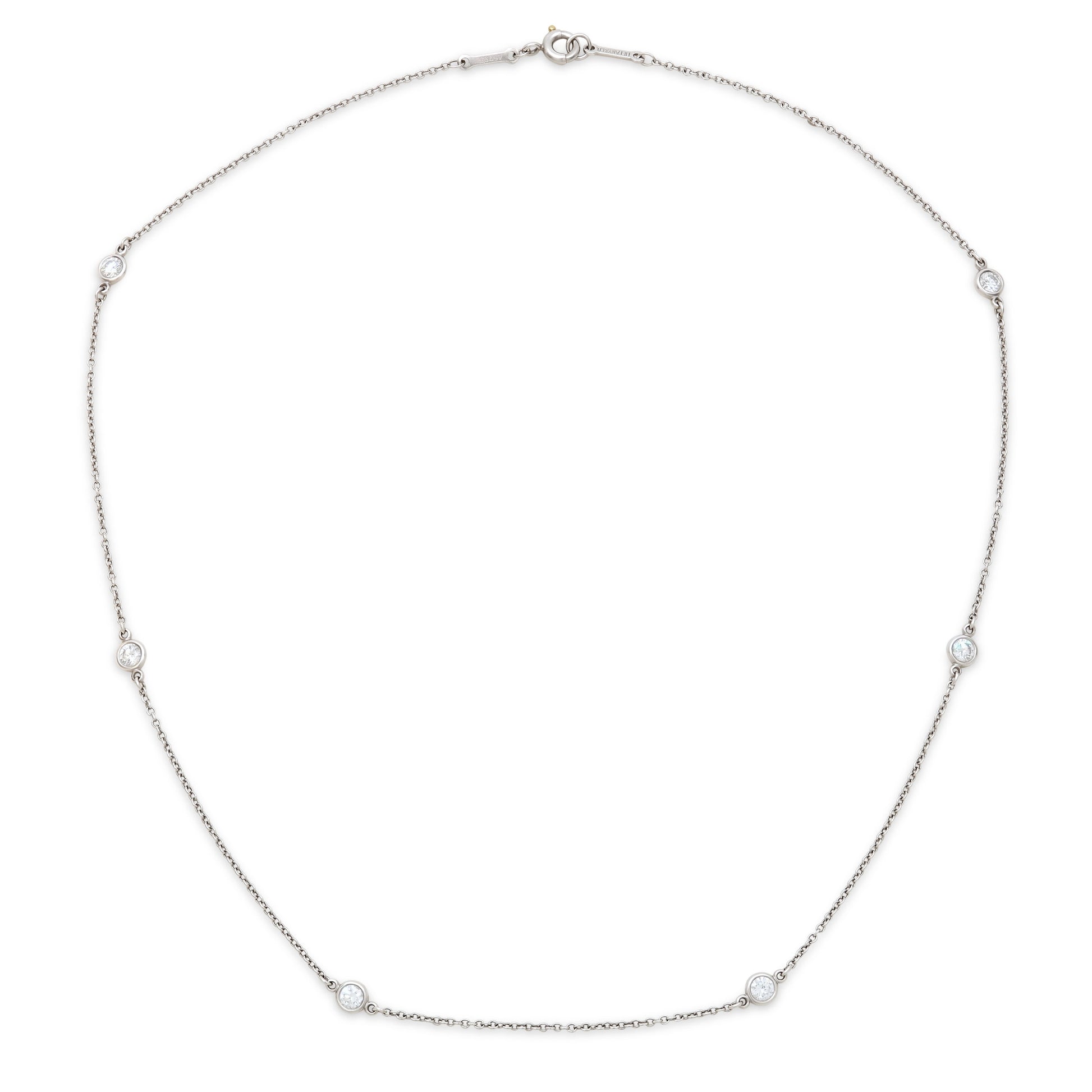 Bezel-set with six round brilliant diamonds, to a delicate platinum chain. Signed Tiffany & Co. Peretti.