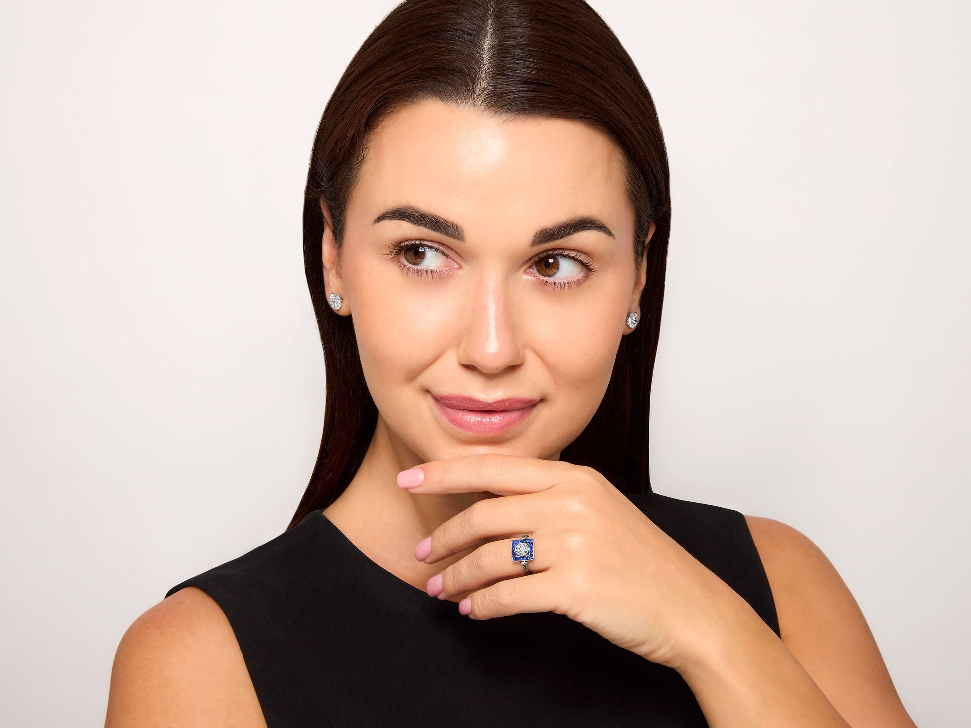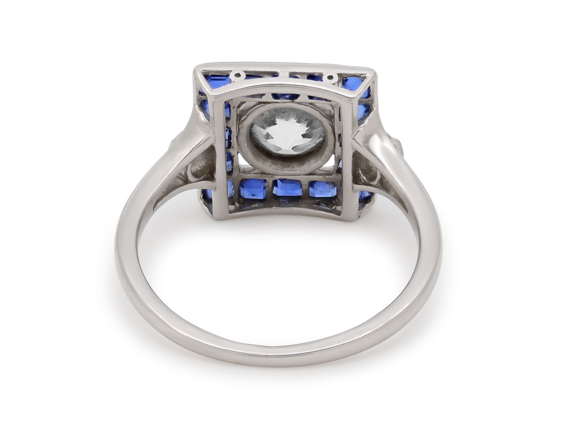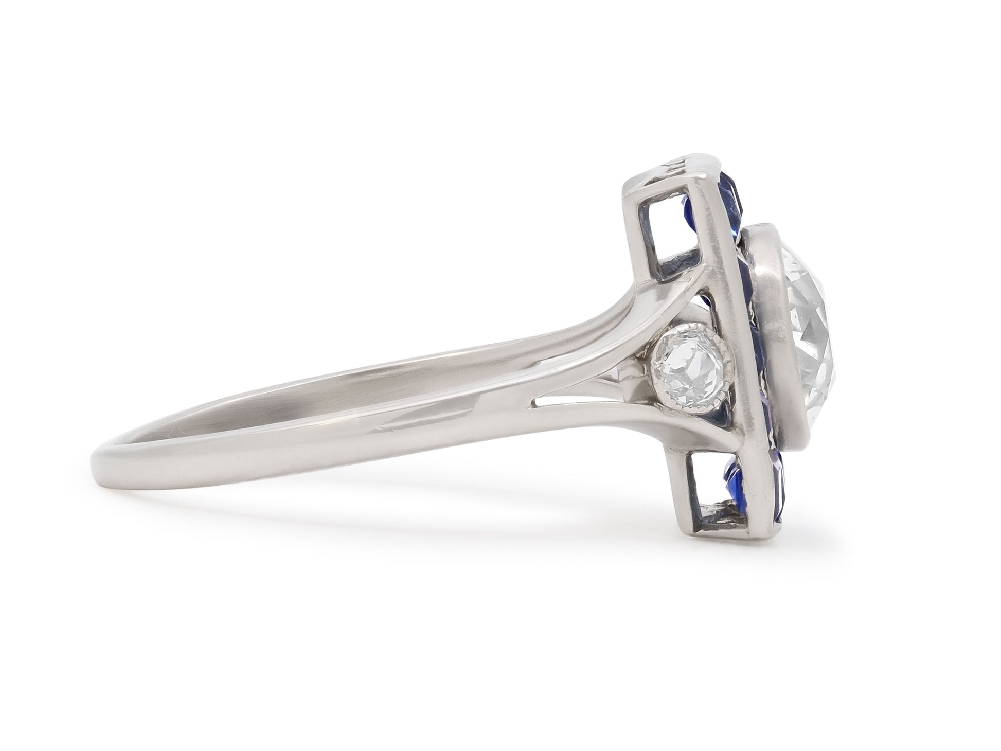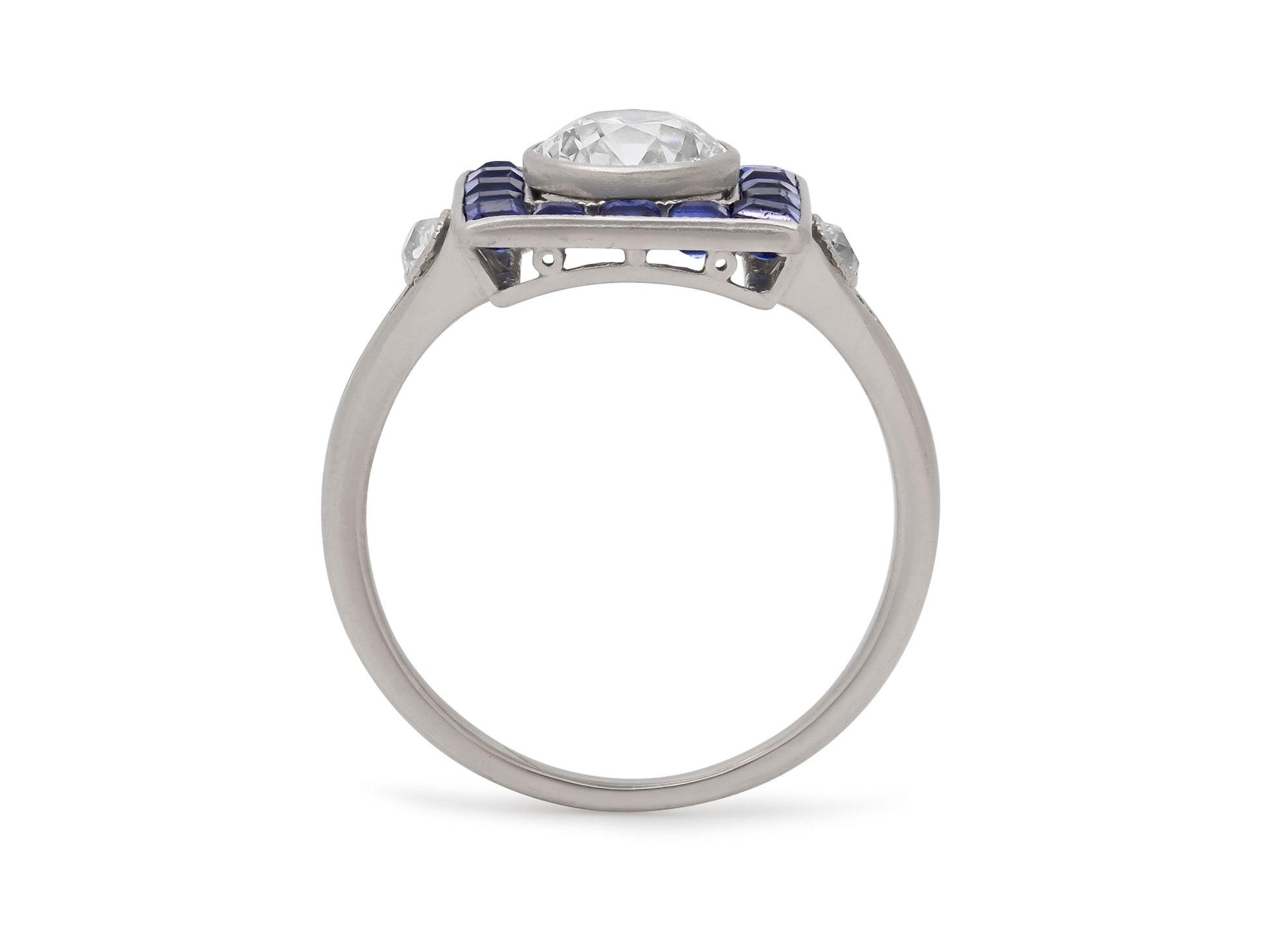 Art Deco Transitional Cut Diamond, 1.08 carat, and Sapphire Ring in Platinum