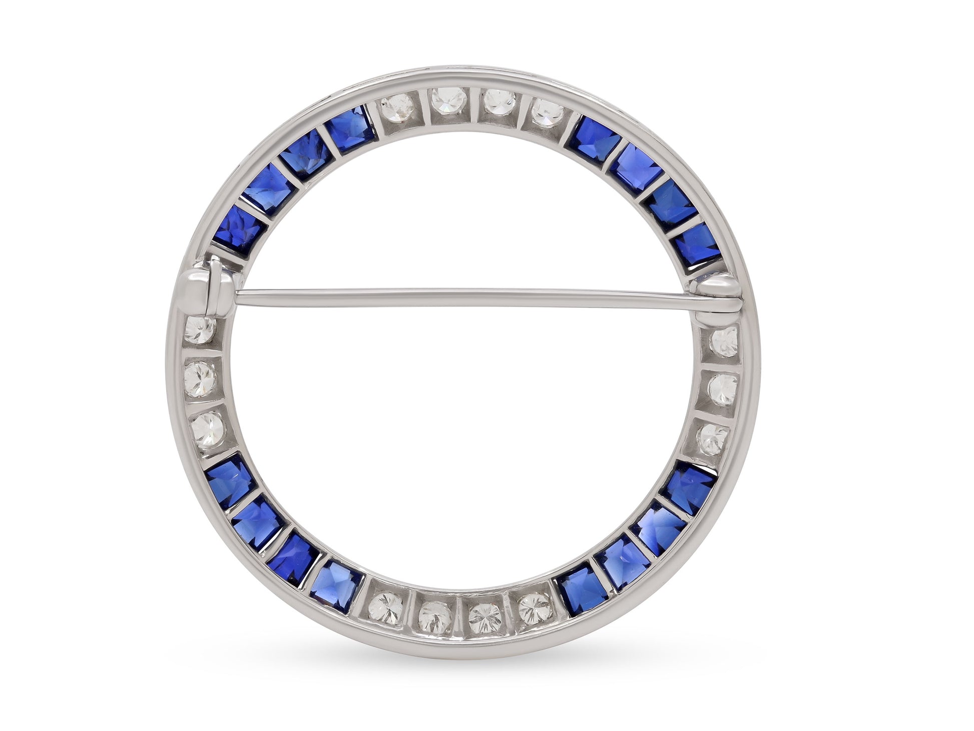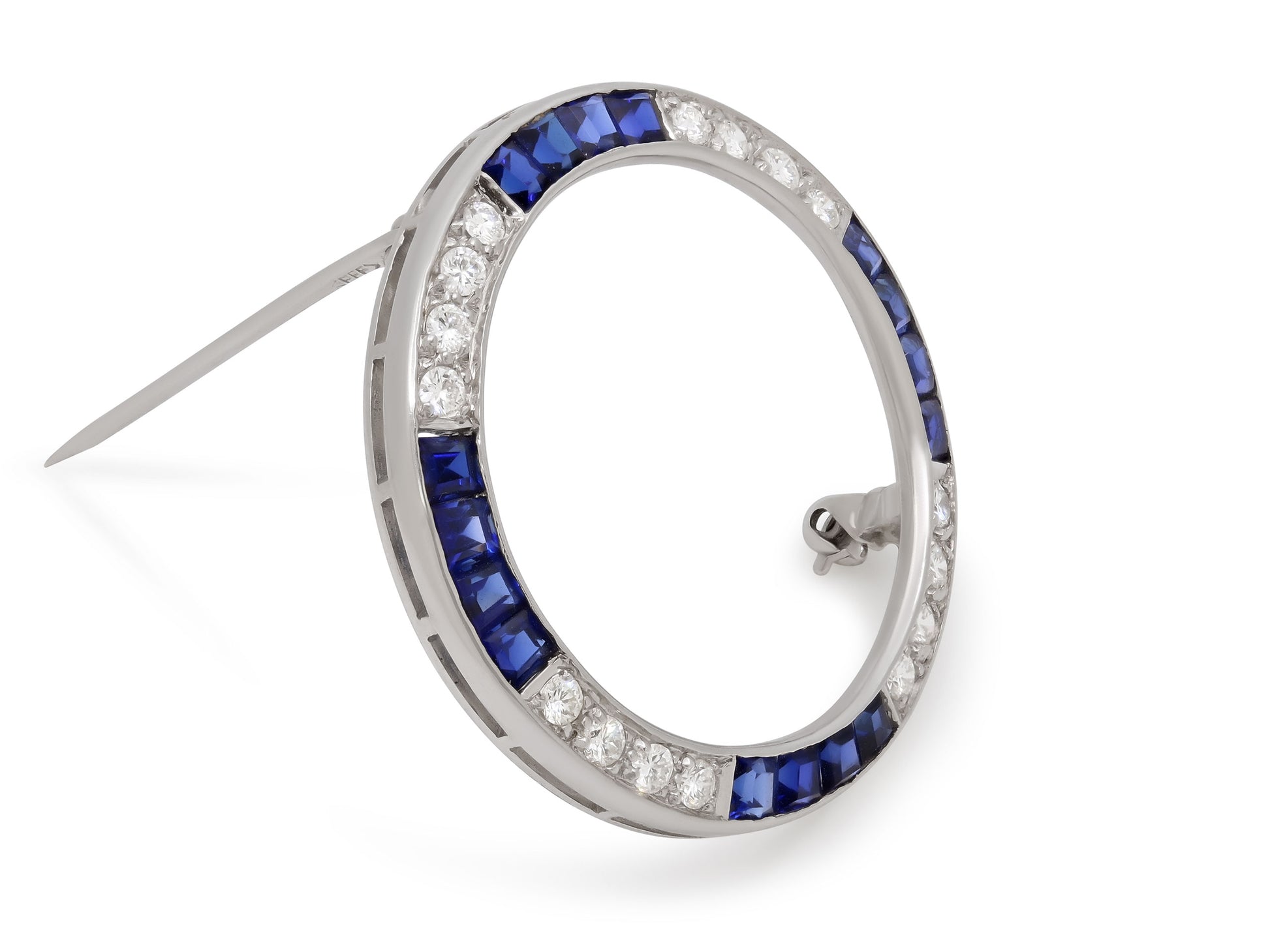 The open circle brooch set with alternating quartets of round brilliant-cut diamonds and step-cut sapphires, in 14K white gold.