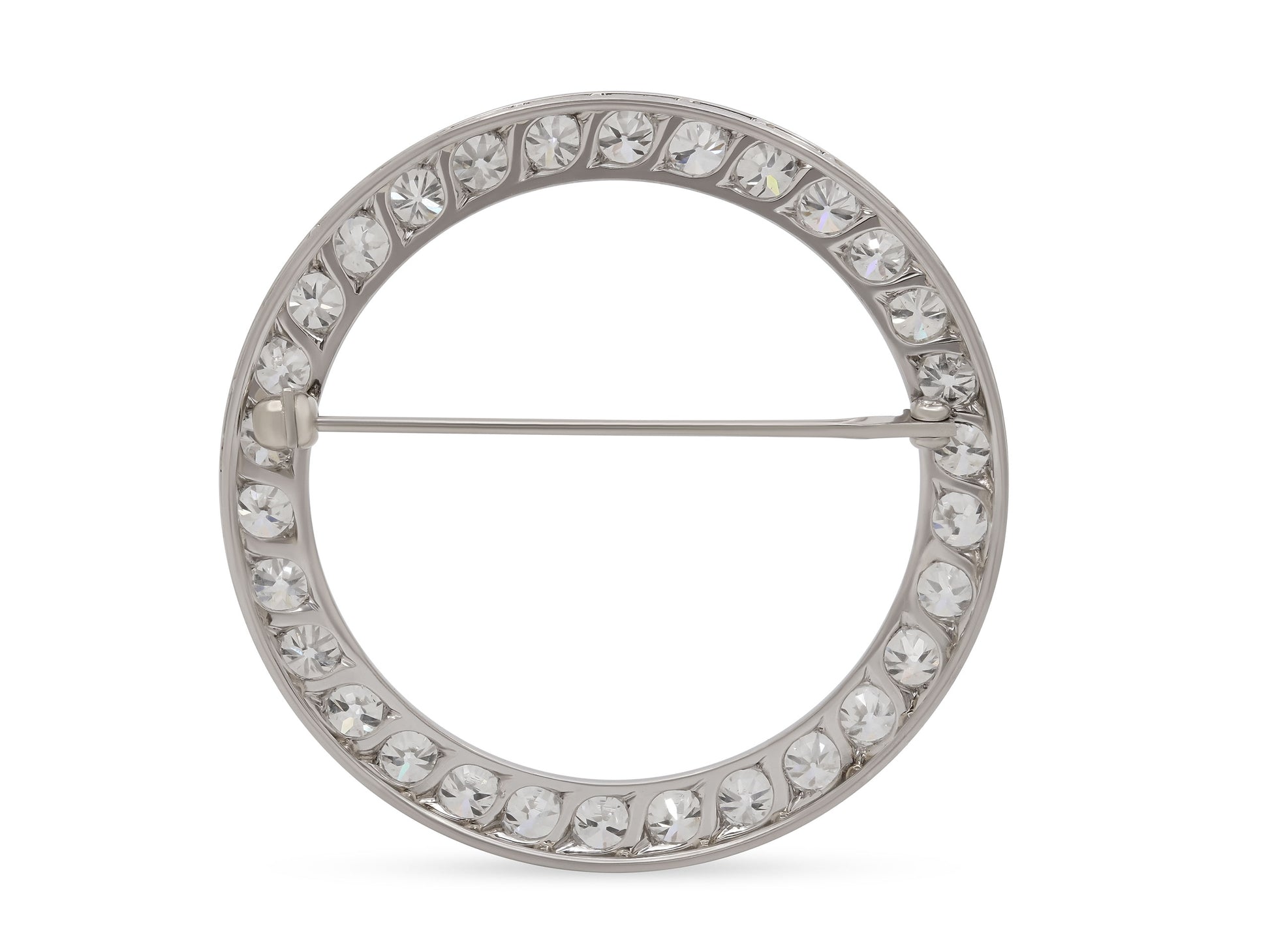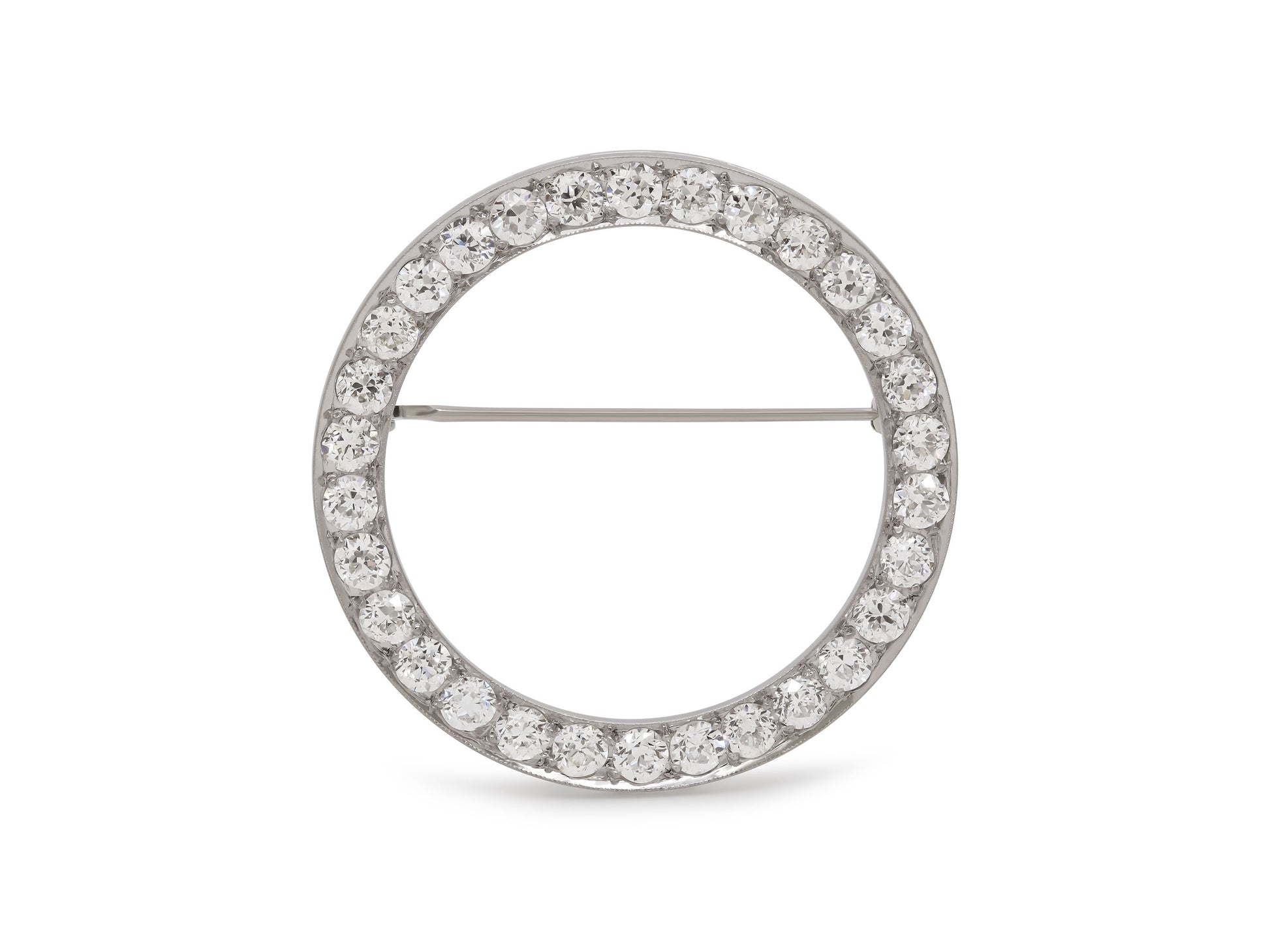The open circle brooch set 30 with old European-cut diamonds, in platinum with a 14k white gold pin back.