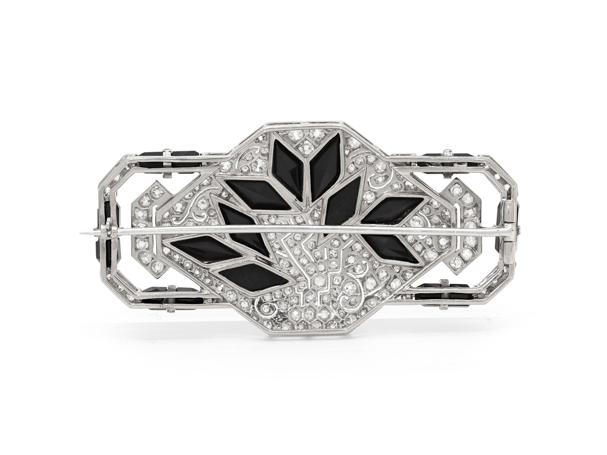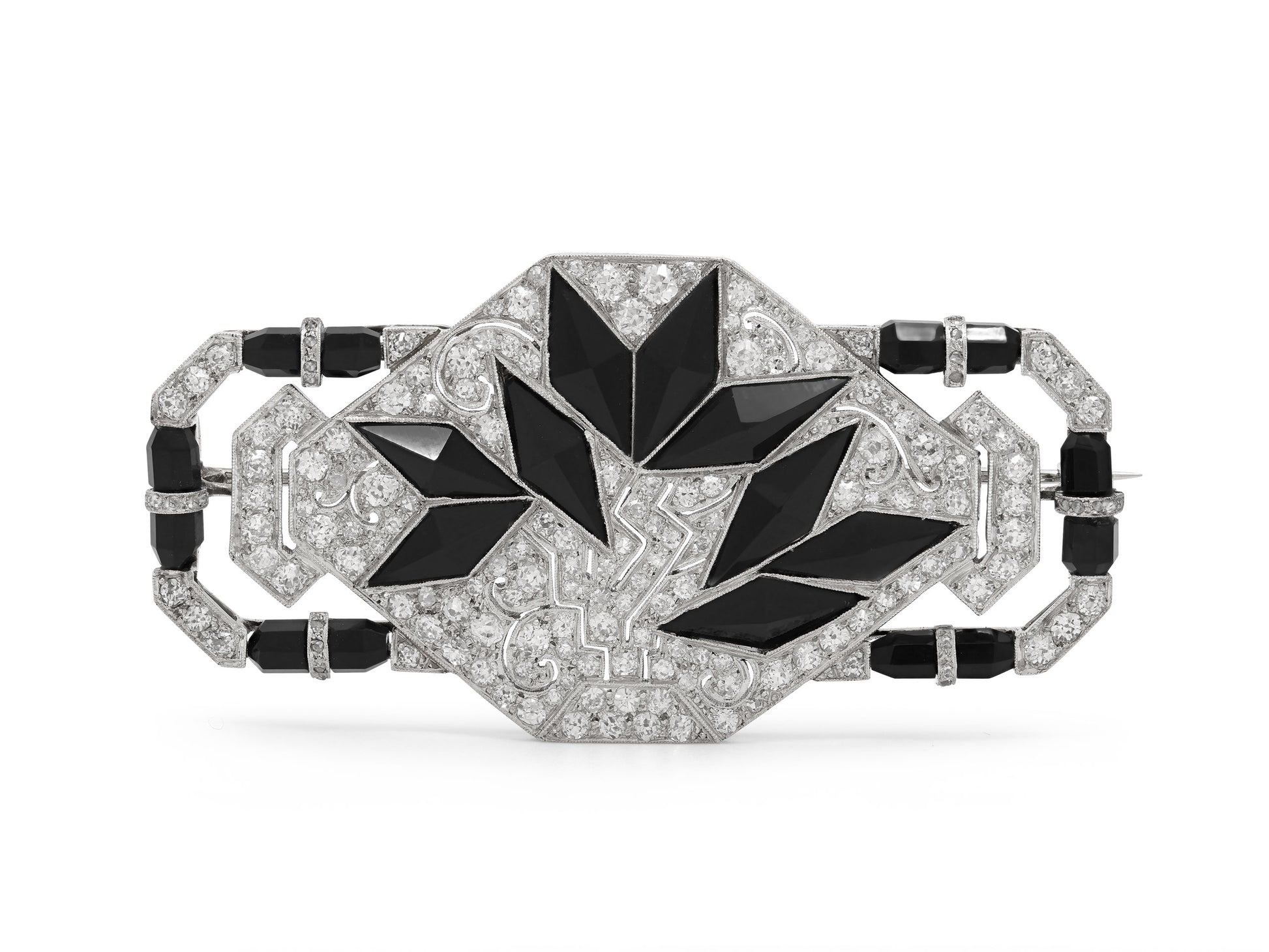 The geometric brooch with an octagonal center panel of pierced design, set with nine onyx lozenges within pavé old cut diamonds, the panel flanked by diamond and onyx lines, set in platinum.