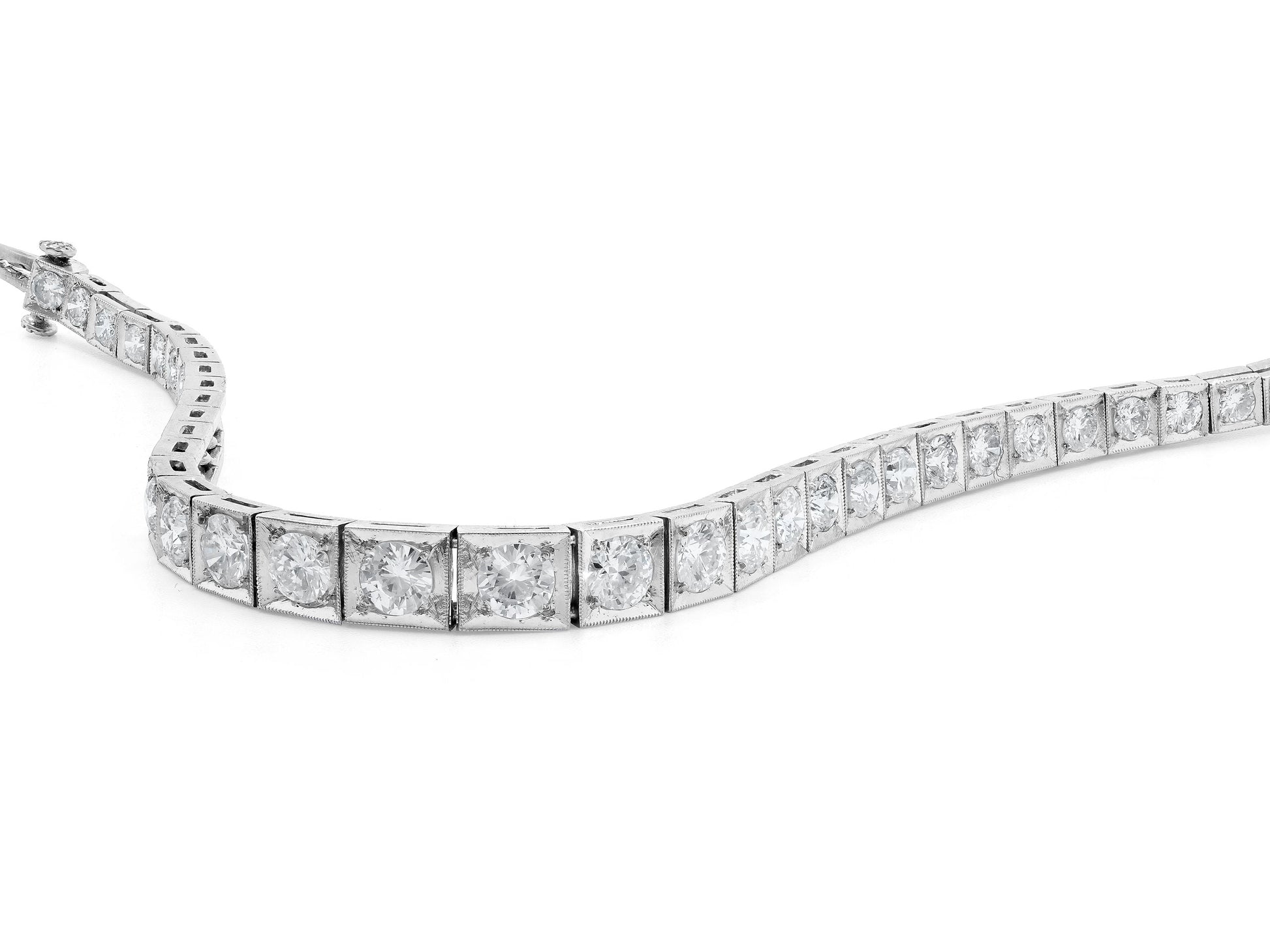 Composed of 36 graduating square platinum links, each set with a round-cut diamond, in millegrain platinum.