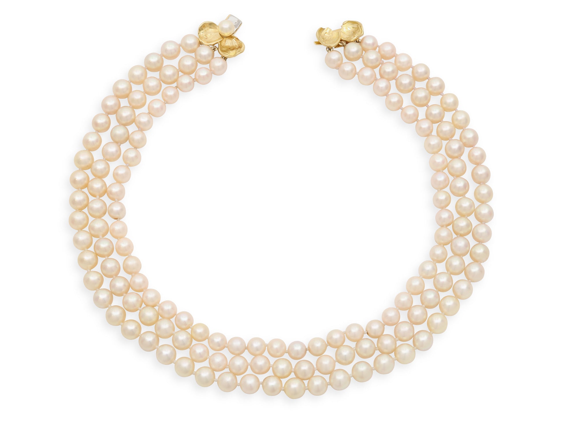 Three graduating strands of cultured pearls to the flower motif clasp centering on a pearl, in 18k yellow gold.