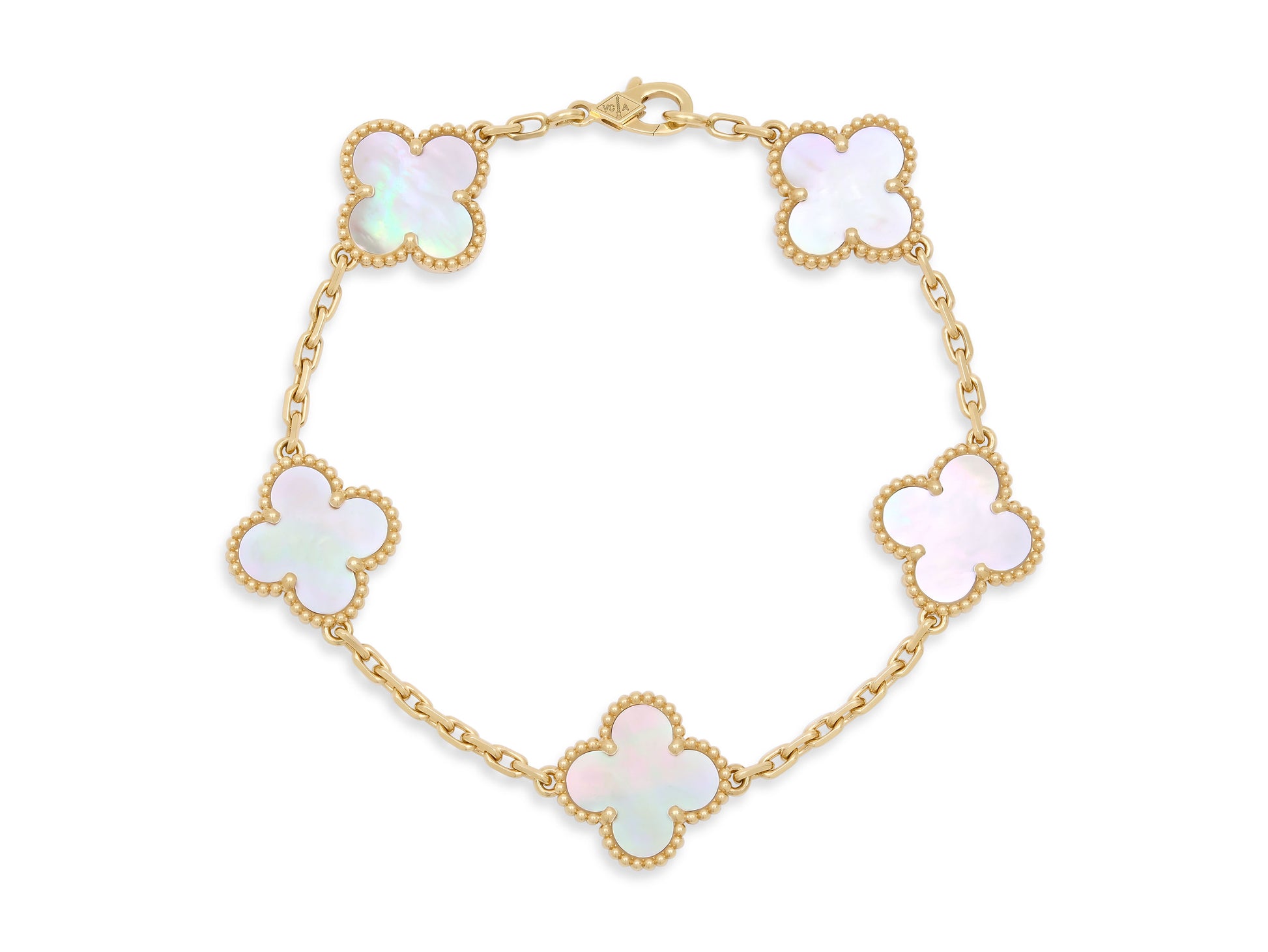 The 18k yellow gold chain in a series of five mother-of-pearl Alhambra motifs. Signed VCA for Van Cleef & Arpels. Includes manufacturer's box.