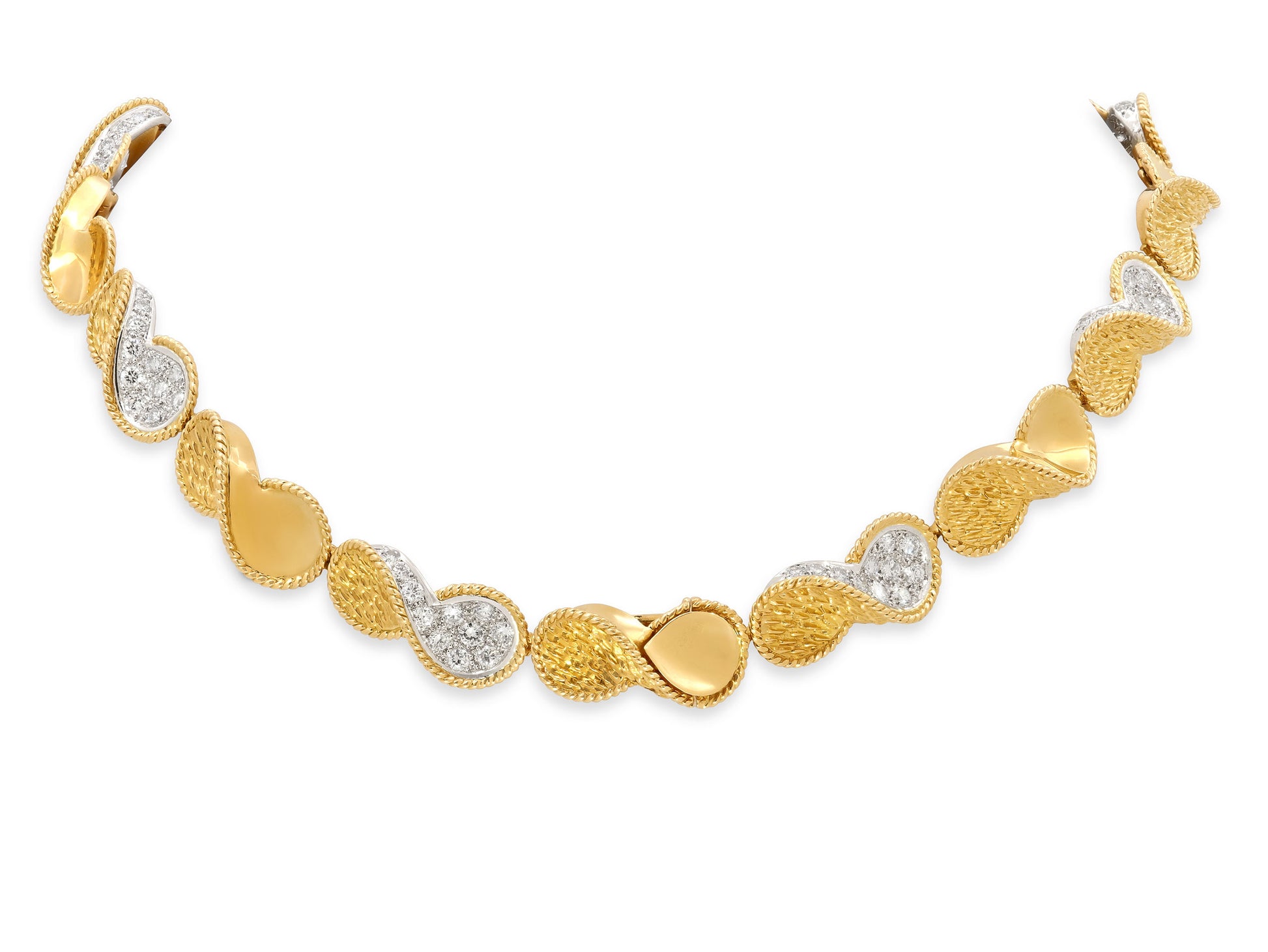 Each bracelet composed of figure of eight links with rope texture borders, alternating between all gold links and gold links with half pavé diamond set in platinum.