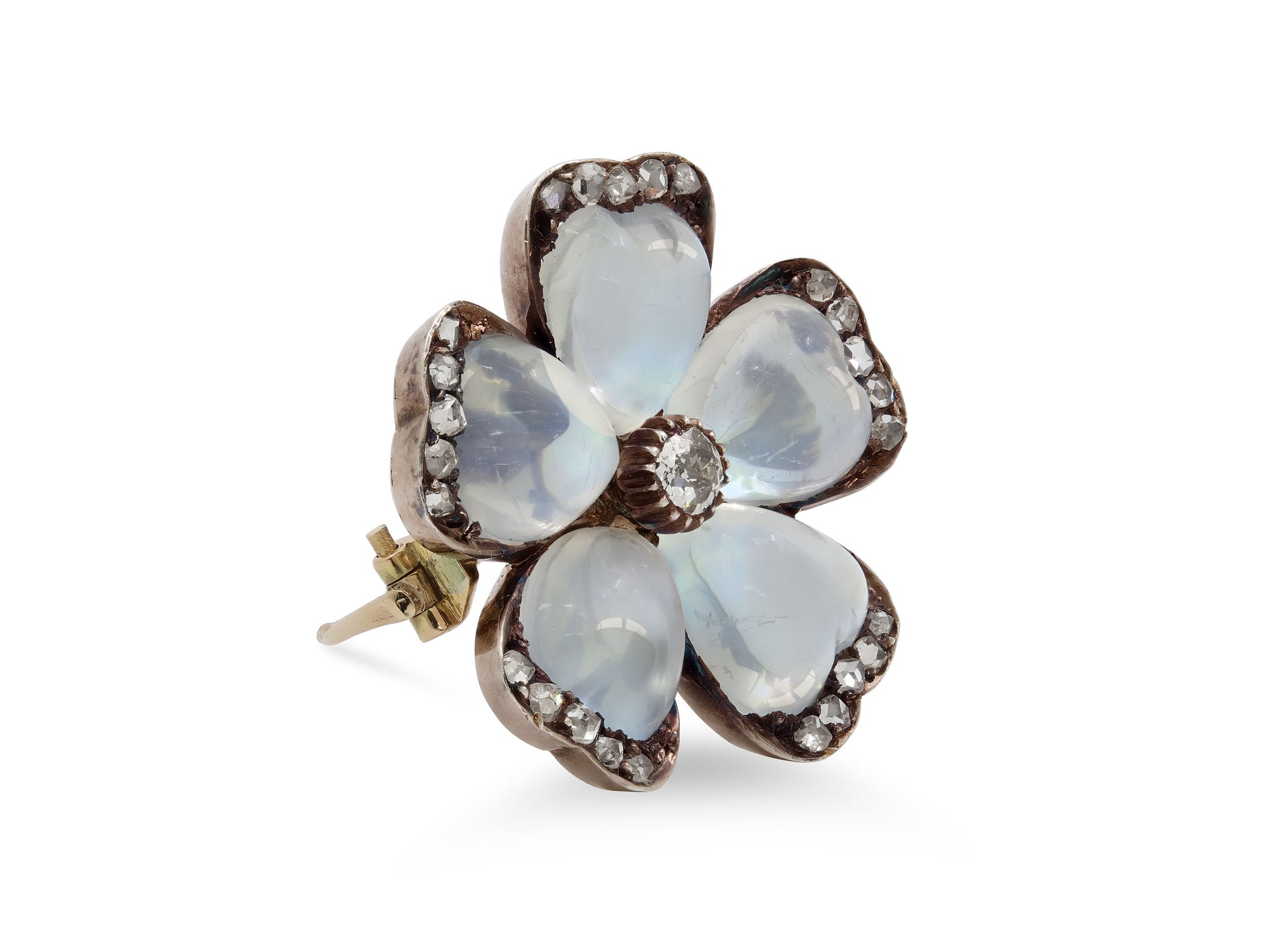 Antique Victorian Moonstone and Diamond Flower Brooch in Silver over Gold