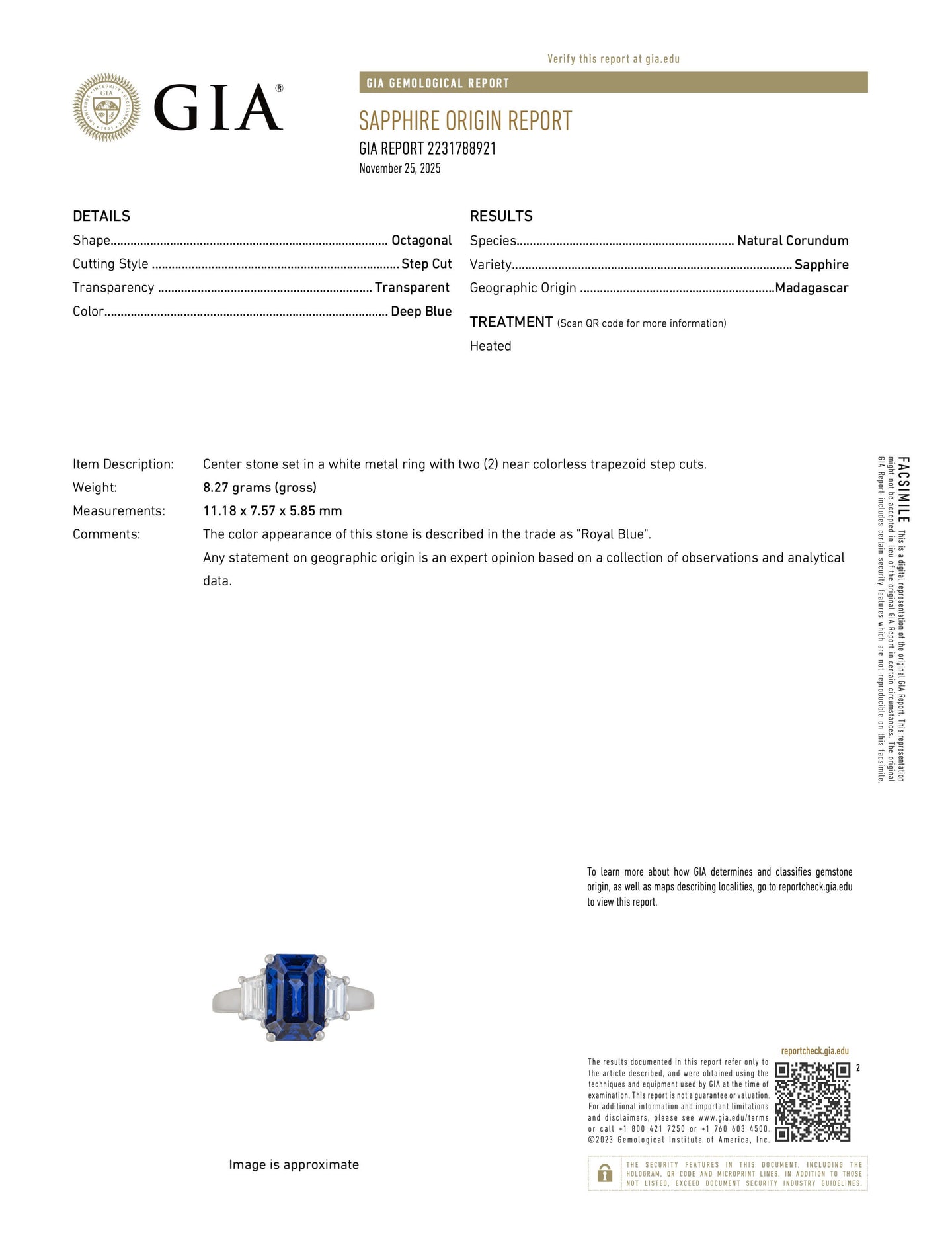 - Gem Stone: Sapphire 5.12 carats Octagonal cut GIA Report No. 2231788921