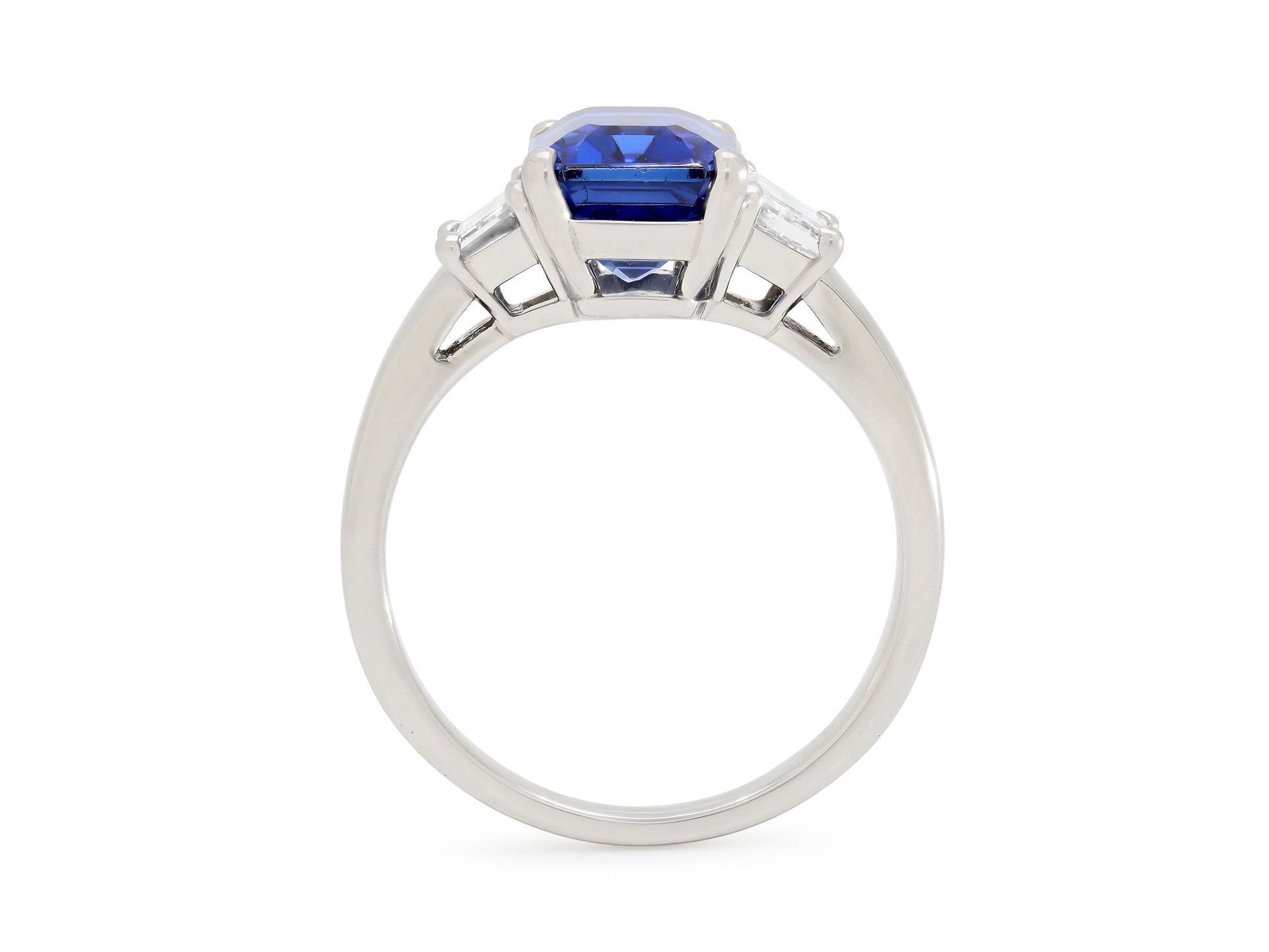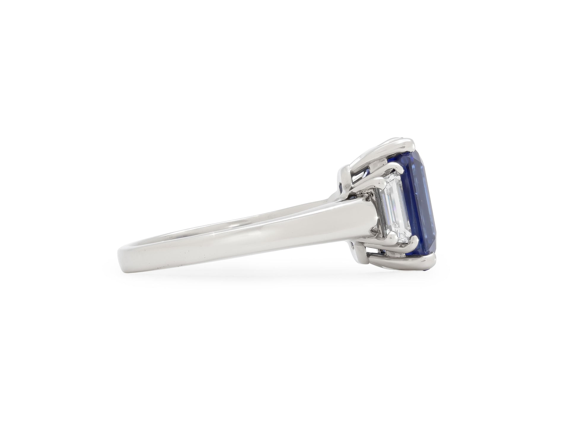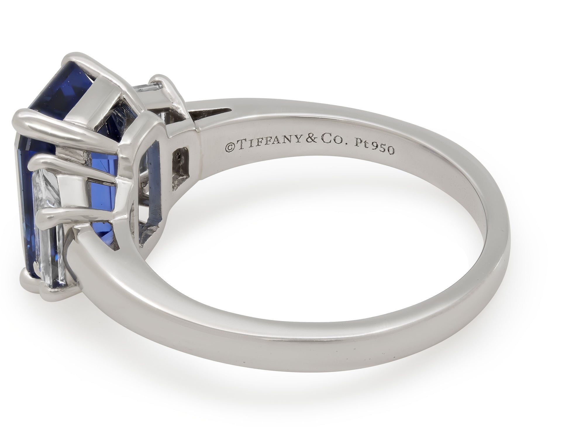The 5.12 carat sapphire prong-set in platinum, between trapezoid cut diamond shoulders, in platinum. Signed Tiffany & Co.