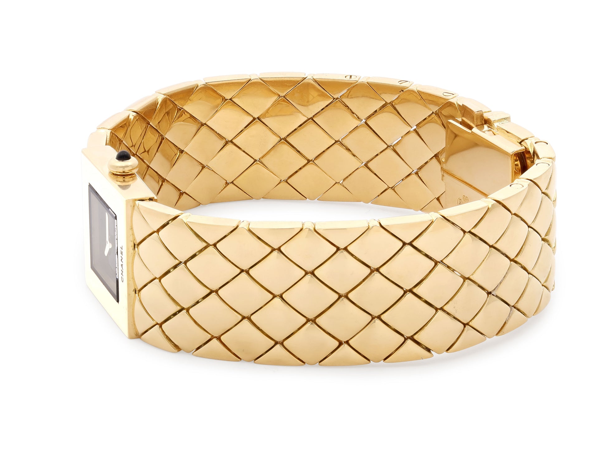 Square black dial with gold hands, to the gold case, to the crown set with a black onyx cabochon, to the quilted bracelet, all in high polish 18k yellow gold. Case and dial signed Chanel.