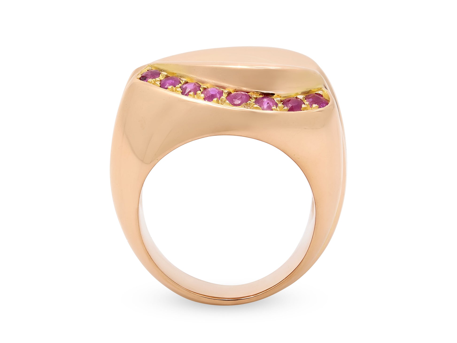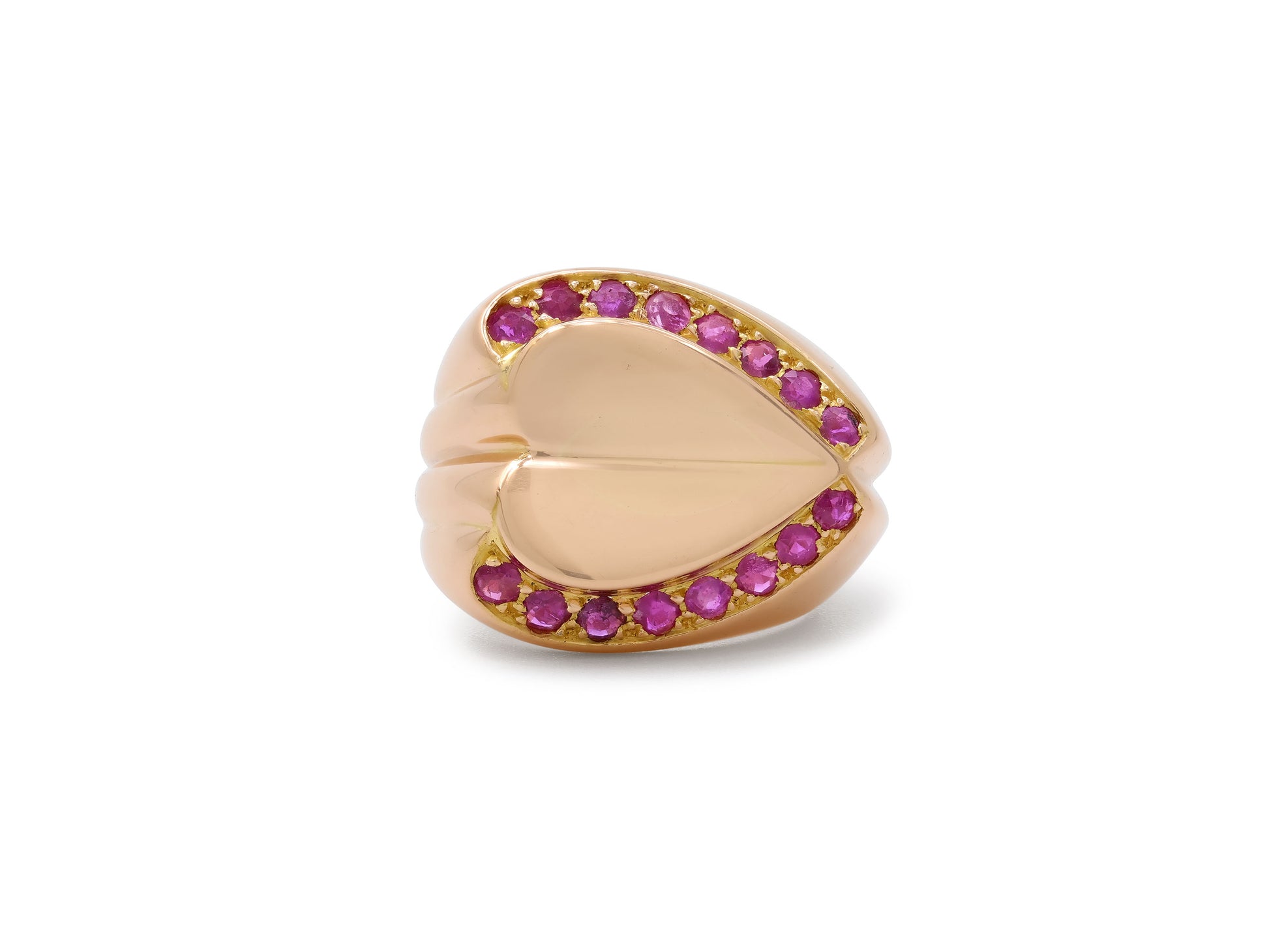 The top of depicting a folded heart, withing a round ruby surround, to the fluted band in 18k yellow gold.
