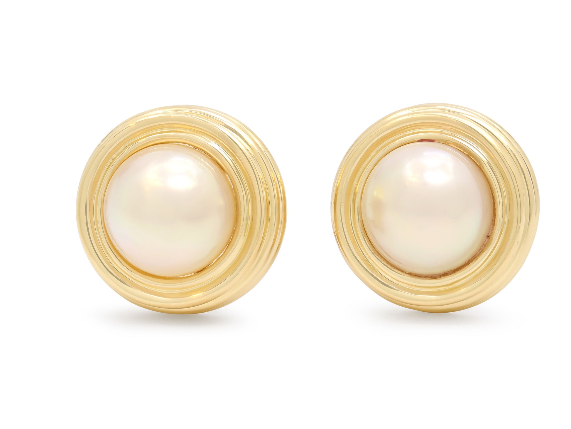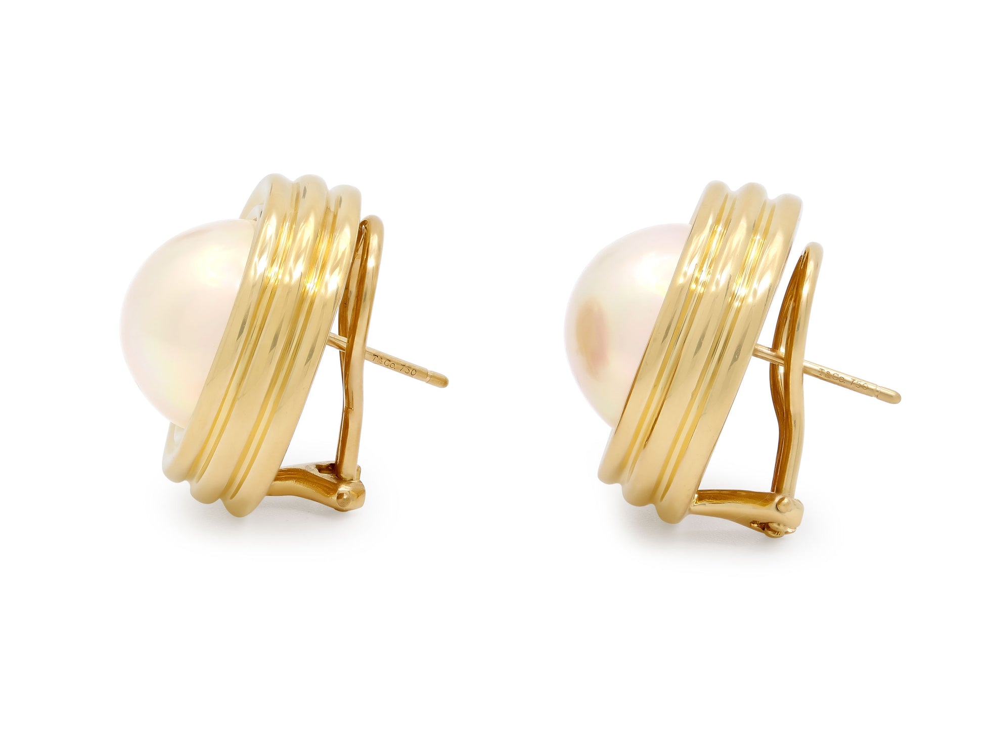 Each with a mabe pearl within fluted gold borders, in high polish 18k yellow gold. Signed Tiffany & Co, with posts and omega backs.