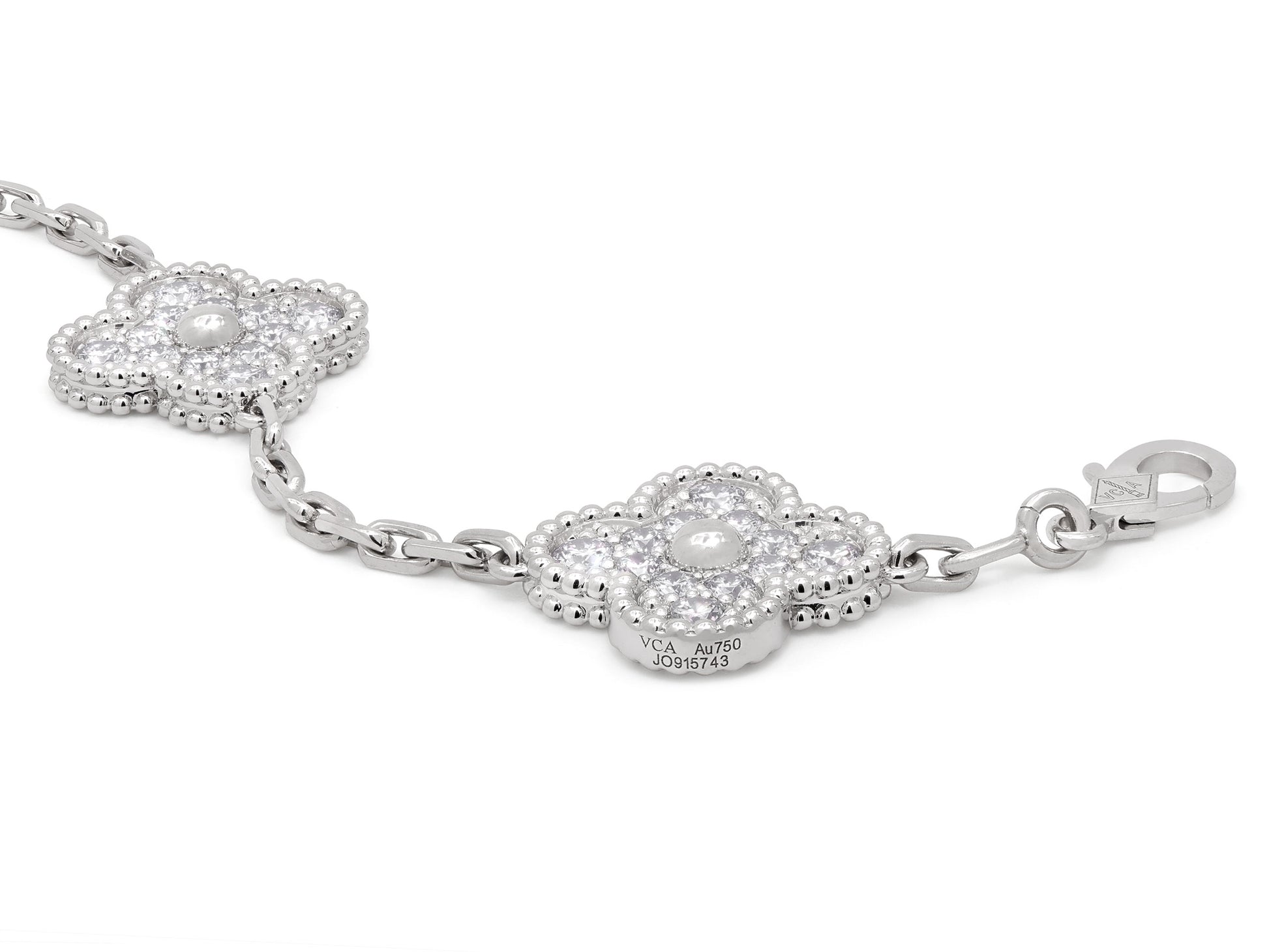 The 18k white gold chain in a series of five pavé diamond Alhambra motifs. Signed VCA for Van Cleef & Arpels, with French hallmarks. Includes manufacturer's box and paperwork.
